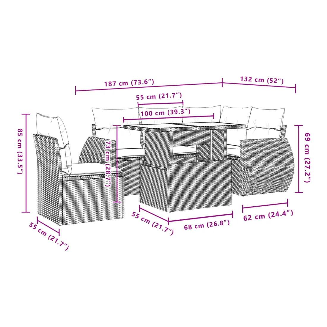 Cet ensemble de canapés de jardin est le complément parfait de votre arrière-cour, terrasse ou patio, offrant un espace confortable et accueillant pour discuter avec la famille et les amis ou simplement se détendre et profiter de l'extérieur. Matériau durable : la résine tressée, également connue sous le nom de poly rotin, est un matériau synthétique solide et nécessitant peu d'entretien qui ressemble au rotin naturel. Il est léger, facile à nettoyer et couramment utilisé pour les meubles d'extérieur en raison de sa durabilité et de ses propriétés de résistance aux intempéries.Dessus de table réglable : le dessus de table peut être soulevé pour rendre la table plus haute, ce qui transforme la table d'extérieur d'une table basse à une table de salle à manger. Elle est parfaite pour recevoir des invités ou prendre des repas à l'extérieur.Expérience d'assise confortable : ce mobilier d'extérieur, doté de coussins épais, offre une expérience d'assise confortable.Housse amovible et lavable : ces coussins de siège sont dotés de housses amovibles pour un lavage et un entretien faciles.Conception modulaire : cet ensemble de meubles d'extérieur a une conception modulaire, ce qui le rend complètement flexible et facile à déplacer, afin que vous puissiez créer un agencement de meubles d'extérieur personnalisé. Bon à savoir :Pour que vos meubles d'extérieur restent beaux, nous vous recommandons de les protéger avec une housse imperméable.
