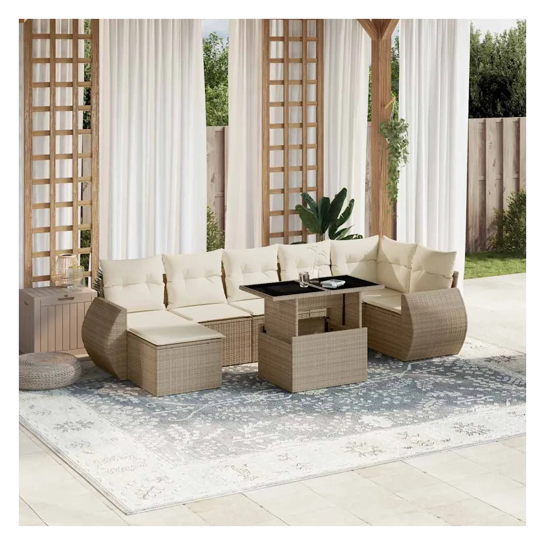 Cet ensemble de canapés de jardin est le complément parfait de votre arrière-cour, terrasse ou patio, offrant un espace confortable et accueillant pour discuter avec la famille et les amis ou simplement se détendre et profiter de l'extérieur. Matériau durable : la résine tressée, également connue sous le nom de poly rotin, est un matériau synthétique solide et nécessitant peu d'entretien qui ressemble au rotin naturel. Il est léger, facile à nettoyer et couramment utilisé pour les meubles d'extérieur en raison de sa durabilité et de ses propriétés de résistance aux intempéries.Dessus de table réglable : le dessus de table peut être soulevé pour rendre la table plus haute, ce qui transforme la table d'extérieur d'une table basse à une table de salle à manger. Elle est parfaite pour recevoir des invités ou prendre des repas à l'extérieur.Expérience d'assise confortable : ce mobilier d'extérieur, doté de coussins épais, offre une expérience d'assise confortable.Housse amovible et lavable : ces coussins de siège sont dotés de housses amovibles pour un lavage et un entretien faciles.Conception modulaire : cet ensemble de meubles d'extérieur a une conception modulaire, ce qui le rend complètement flexible et facile à déplacer, afin que vous puissiez créer un agencement de meubles d'extérieur personnalisé. Bon à savoir :Pour que vos meubles d'extérieur restent beaux, nous vous recommandons de les protéger avec une housse imperméable.