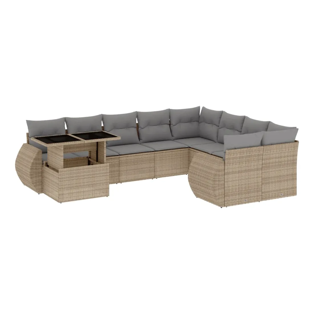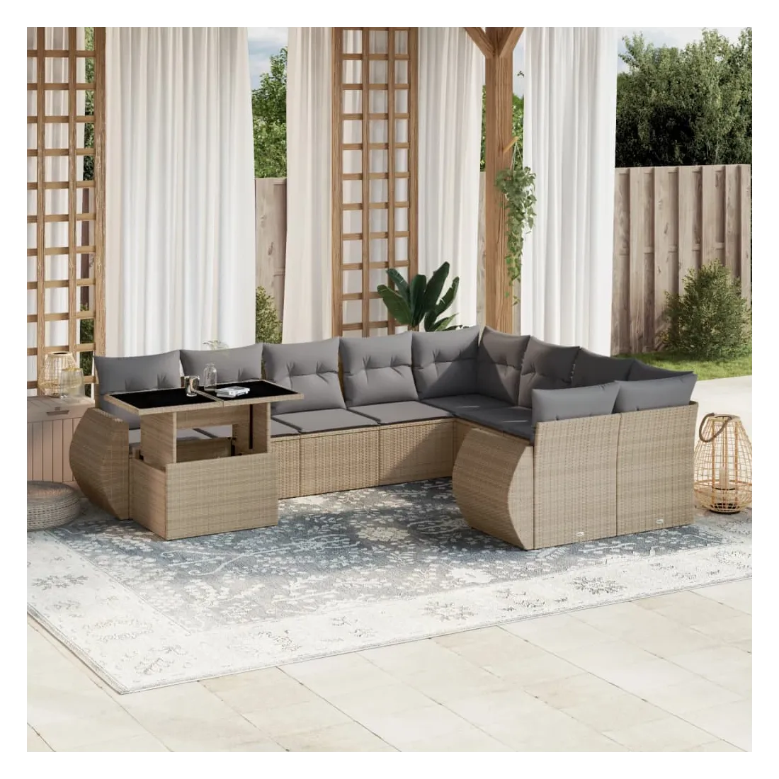 Cet ensemble de canapés de jardin est le complément parfait de votre arrière-cour, terrasse ou patio, offrant un espace confortable et accueillant pour discuter avec la famille et les amis ou simplement se détendre et profiter de l'extérieur. Matériau durable : la résine tressée, également connue sous le nom de poly rotin, est un matériau synthétique solide et nécessitant peu d'entretien qui ressemble au rotin naturel. Il est léger, facile à nettoyer et couramment utilisé pour les meubles d'extérieur en raison de sa durabilité et de ses propriétés de résistance aux intempéries.Dessus de table réglable : le dessus de table peut être soulevé pour rendre la table plus haute, ce qui transforme la table d'extérieur d'une table basse à une table de salle à manger. Elle est parfaite pour recevoir des invités ou prendre des repas à l'extérieur.Expérience d'assise confortable : ce mobilier d'extérieur, doté de coussins épais, offre une expérience d'assise confortable.Housse amovible et lavable : ces coussins de siège sont dotés de housses amovibles pour un lavage et un entretien faciles.Conception modulaire : cet ensemble de meubles d'extérieur a une conception modulaire, ce qui le rend complètement flexible et facile à déplacer, afin que vous puissiez créer un agencement de meubles d'extérieur personnalisé. Bon à savoir :Pour que vos meubles d'extérieur restent beaux, nous vous recommandons de les protéger avec une housse imperméable.
