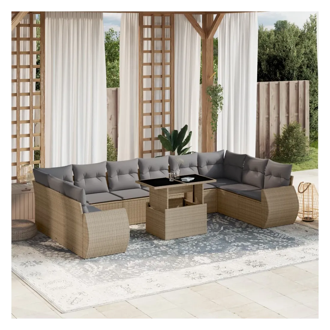 Cet ensemble de canapés de jardin est le complément parfait de votre arrière-cour, terrasse ou patio, offrant un espace confortable et accueillant pour discuter avec la famille et les amis ou simplement se détendre et profiter de l'extérieur. Matériau durable : la résine tressée, également connue sous le nom de poly rotin, est un matériau synthétique solide et nécessitant peu d'entretien qui ressemble au rotin naturel. Il est léger, facile à nettoyer et couramment utilisé pour les meubles d'extérieur en raison de sa durabilité et de ses propriétés de résistance aux intempéries.Dessus de table réglable : le dessus de table peut être soulevé pour rendre la table plus haute, ce qui transforme la table d'extérieur d'une table basse à une table de salle à manger. Elle est parfaite pour recevoir des invités ou prendre des repas à l'extérieur.Expérience d'assise confortable : ce mobilier d'extérieur, doté de coussins épais, offre une expérience d'assise confortable.Housse amovible et lavable : ces coussins de siège sont dotés de housses amovibles pour un lavage et un entretien faciles.Conception modulaire : cet ensemble de meubles d'extérieur a une conception modulaire, ce qui le rend complètement flexible et facile à déplacer, afin que vous puissiez créer un agencement de meubles d'extérieur personnalisé. Bon à savoir :Pour que vos meubles d'extérieur restent beaux, nous vous recommandons de les protéger avec une housse imperméable.