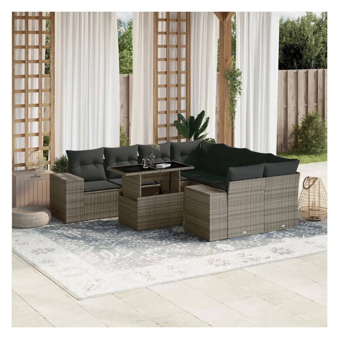 Cet ensemble de canapés de jardin est le complément parfait de votre arrière-cour, terrasse ou patio, offrant un espace confortable et accueillant pour discuter avec la famille et les amis ou simplement se détendre et profiter de l'extérieur. Matériau durable : la résine tressée, également connue sous le nom de poly rotin, est un matériau synthétique solide et nécessitant peu d'entretien qui ressemble au rotin naturel. Il est léger, facile à nettoyer et couramment utilisé pour les meubles d'extérieur en raison de sa durabilité et de ses propriétés de résistance aux intempéries.Dessus de table réglable : le dessus de table peut être soulevé pour rendre la table plus haute, ce qui transforme la table d'extérieur d'une table basse à une table de salle à manger. Elle est parfaite pour recevoir des invités ou prendre des repas à l'extérieur.Expérience d'assise confortable : ce mobilier d'extérieur, doté de coussins épais, offre une expérience d'assise confortable.Housse amovible et lavable : ces coussins de siège sont dotés de housses amovibles pour un lavage et un entretien faciles.Conception modulaire : cet ensemble de meubles d'extérieur a une conception modulaire, ce qui le rend complètement flexible et facile à déplacer, afin que vous puissiez créer un agencement de meubles d'extérieur personnalisé. Bon à savoir :Pour que vos meubles d'extérieur restent beaux, nous vous recommandons de les protéger avec une housse imperméable.