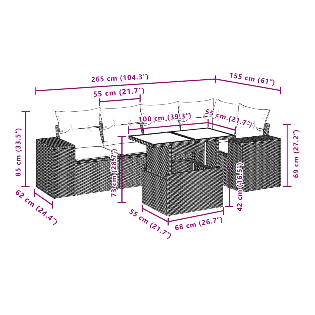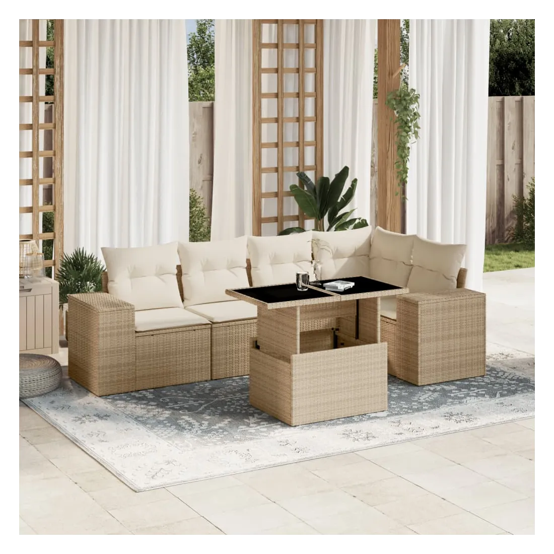 Cet ensemble de canapés de jardin est le complément parfait de votre arrière-cour, terrasse ou patio, offrant un espace confortable et accueillant pour discuter avec la famille et les amis ou simplement se détendre et profiter de l'extérieur. Matériau durable : la résine tressée, également connue sous le nom de poly rotin, est un matériau synthétique solide et nécessitant peu d'entretien qui ressemble au rotin naturel. Il est léger, facile à nettoyer et couramment utilisé pour les meubles d'extérieur en raison de sa durabilité et de ses propriétés de résistance aux intempéries.Dessus de table réglable : le dessus de table peut être soulevé pour rendre la table plus haute, ce qui transforme la table d'extérieur d'une table basse à une table de salle à manger. Elle est parfaite pour recevoir des invités ou prendre des repas à l'extérieur.Expérience d'assise confortable : ce mobilier d'extérieur, doté de coussins épais, offre une expérience d'assise confortable.Housse amovible et lavable : ces coussins de siège sont dotés de housses amovibles pour un lavage et un entretien faciles.Conception modulaire : cet ensemble de meubles d'extérieur a une conception modulaire, ce qui le rend complètement flexible et facile à déplacer, afin que vous puissiez créer un agencement de meubles d'extérieur personnalisé. Bon à savoir :Pour que vos meubles d'extérieur restent beaux, nous vous recommandons de les protéger avec une housse imperméable.