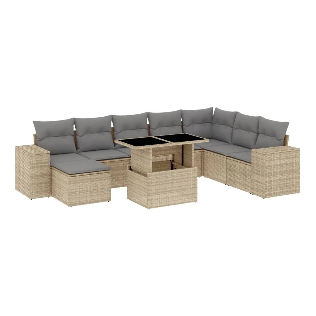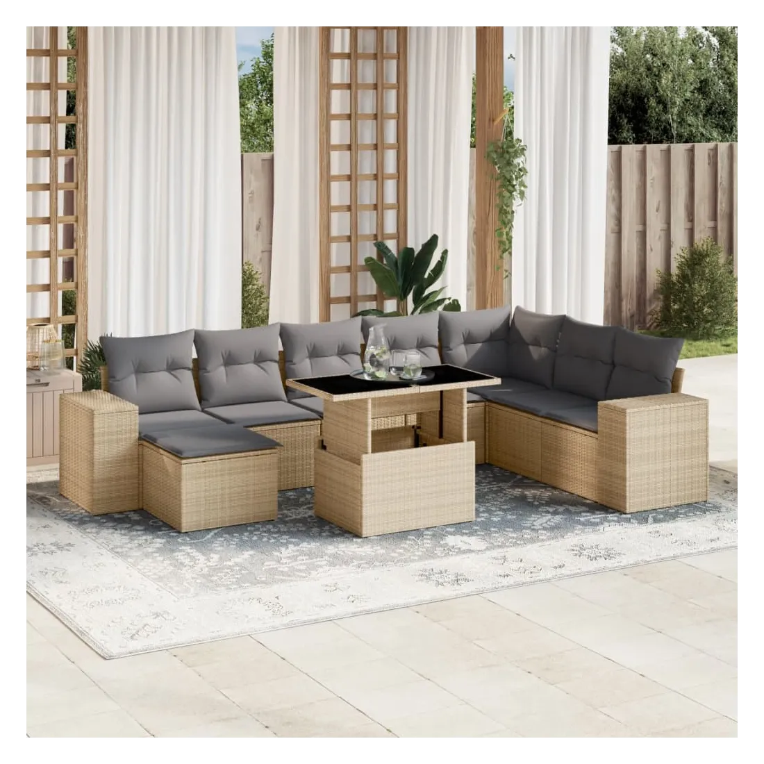 Cet ensemble de canapés de jardin est le complément parfait de votre arrière-cour, terrasse ou patio, offrant un espace confortable et accueillant pour discuter avec la famille et les amis ou simplement se détendre et profiter de l'extérieur. Matériau durable : la résine tressée, également connue sous le nom de poly rotin, est un matériau synthétique solide et nécessitant peu d'entretien qui ressemble au rotin naturel. Il est léger, facile à nettoyer et couramment utilisé pour les meubles d'extérieur en raison de sa durabilité et de ses propriétés de résistance aux intempéries.Dessus de table réglable : le dessus de table peut être soulevé pour rendre la table plus haute, ce qui transforme la table d'extérieur d'une table basse à une table de salle à manger. Elle est parfaite pour recevoir des invités ou prendre des repas à l'extérieur.Expérience d'assise confortable : ce mobilier d'extérieur, doté de coussins épais, offre une expérience d'assise confortable.Housse amovible et lavable : ces coussins de siège sont dotés de housses amovibles pour un lavage et un entretien faciles.Conception modulaire : cet ensemble de meubles d'extérieur a une conception modulaire, ce qui le rend complètement flexible et facile à déplacer, afin que vous puissiez créer un agencement de meubles d'extérieur personnalisé. Bon à savoir :Pour que vos meubles d'extérieur restent beaux, nous vous recommandons de les protéger avec une housse imperméable.