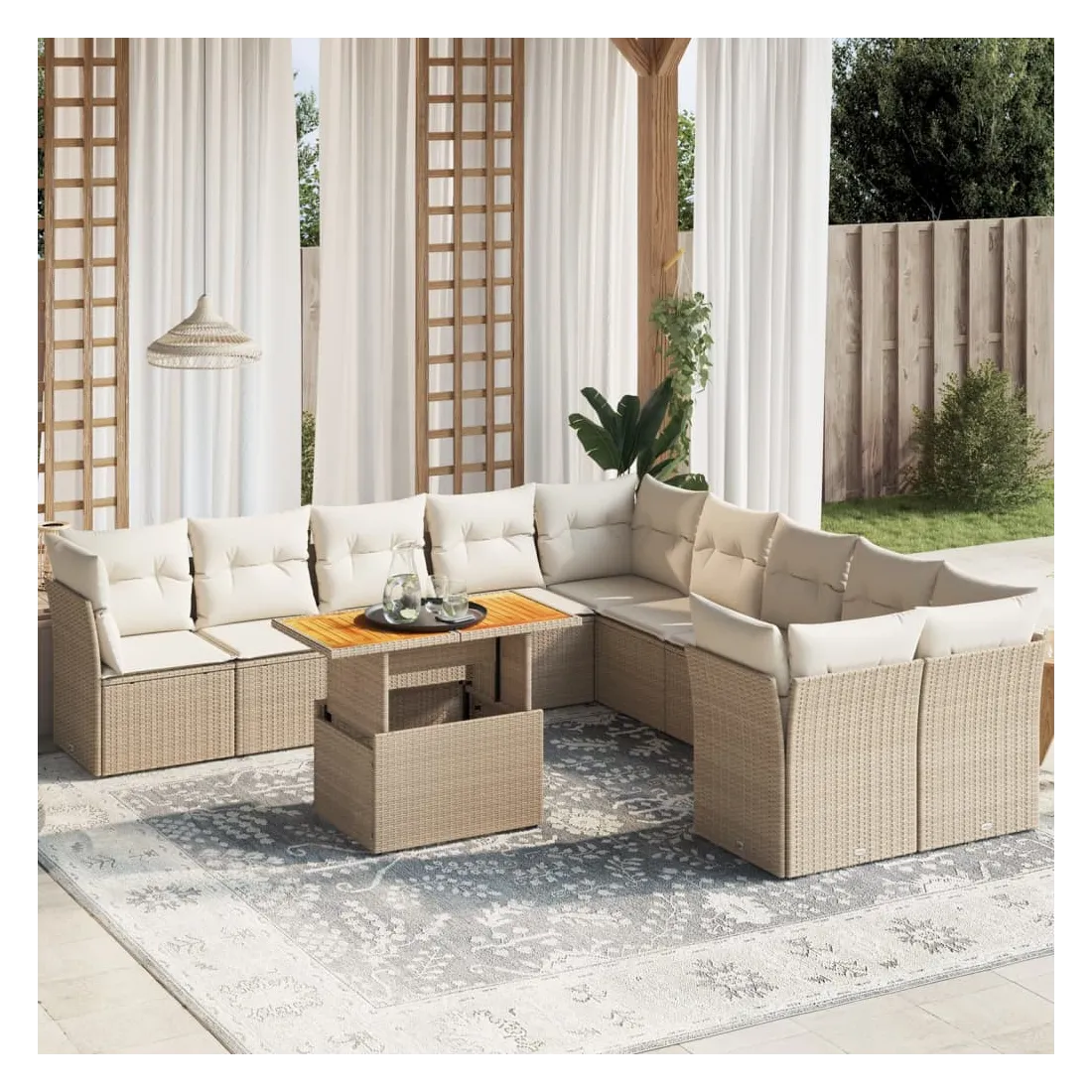 Cet ensemble de canapés de jardin est le complément parfait de votre arrière-cour, terrasse ou patio, offrant un espace confortable et accueillant pour discuter avec la famille et les amis ou simplement se détendre et profiter de l'extérieur. Matériau durable : la résine tressée, également connue sous le nom de poly rotin, est un matériau synthétique solide et nécessitant peu d'entretien qui ressemble au rotin naturel. Il est léger, facile à nettoyer et couramment utilisé pour les meubles d'extérieur en raison de sa durabilité et de ses propriétés de résistance aux intempéries.Dessus de table réglable : le dessus de table peut être soulevé pour rendre la table plus haute, ce qui transforme la table d'extérieur d'une table basse à une table de salle à manger. Elle est parfaite pour recevoir des invités ou prendre des repas à l'extérieur.Expérience d'assise confortable : ce mobilier d'extérieur, doté de coussins épais, offre une expérience d'assise confortable.Housse amovible et lavable : ces coussins de siège sont dotés de housses amovibles pour un lavage et un entretien faciles.Conception modulaire : cet ensemble de meubles d'extérieur a une conception modulaire, ce qui le rend complètement flexible et facile à déplacer, afin que vous puissiez créer un agencement de meubles d'extérieur personnalisé. Bon à savoir :Pour que vos meubles d'extérieur restent beaux, nous vous recommandons de les protéger avec une housse imperméable.