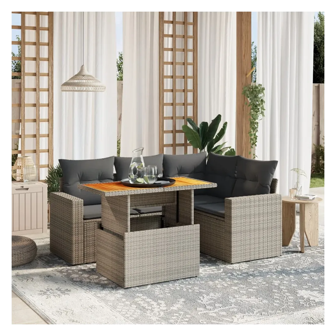 Cet ensemble de canapés de jardin est le complément parfait de votre arrière-cour, terrasse ou patio, offrant un espace confortable et accueillant pour discuter avec la famille et les amis ou simplement se détendre et profiter de l'extérieur. Matériau durable : la résine tressée, également connue sous le nom de poly rotin, est un matériau synthétique solide et nécessitant peu d'entretien qui ressemble au rotin naturel. Il est léger, facile à nettoyer et couramment utilisé pour les meubles d'extérieur en raison de sa durabilité et de ses propriétés de résistance aux intempéries.Dessus de table réglable : le dessus de table peut être soulevé pour rendre la table plus haute, ce qui transforme la table d'extérieur d'une table basse à une table de salle à manger. Elle est parfaite pour recevoir des invités ou prendre des repas à l'extérieur.Expérience d'assise confortable : ce mobilier d'extérieur, doté de coussins épais, offre une expérience d'assise confortable.Housse amovible et lavable : ces coussins de siège sont dotés de housses amovibles pour un lavage et un entretien faciles.Conception modulaire : cet ensemble de meubles d'extérieur a une conception modulaire, ce qui le rend complètement flexible et facile à déplacer, afin que vous puissiez créer un agencement de meubles d'extérieur personnalisé. Bon à savoir :Pour que vos meubles d'extérieur restent beaux, nous vous recommandons de les protéger avec une housse imperméable.