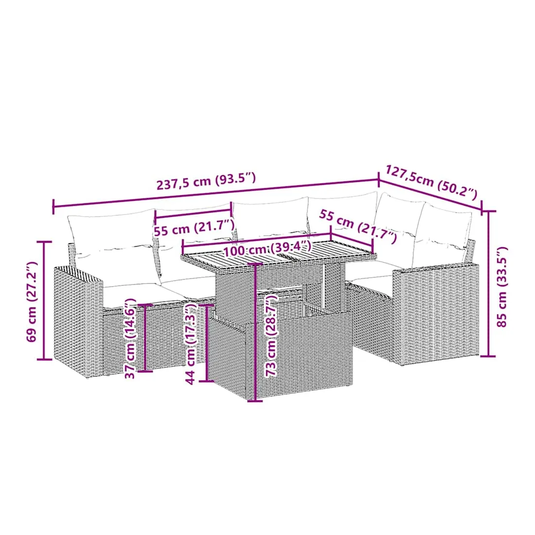 Cet ensemble de canapés de jardin est le complément parfait de votre arrière-cour, terrasse ou patio, offrant un espace confortable et accueillant pour discuter avec la famille et les amis ou simplement se détendre et profiter de l'extérieur. Matériau durable : la résine tressée, également connue sous le nom de poly rotin, est un matériau synthétique solide et nécessitant peu d'entretien qui ressemble au rotin naturel. Il est léger, facile à nettoyer et couramment utilisé pour les meubles d'extérieur en raison de sa durabilité et de ses propriétés de résistance aux intempéries.Dessus de table réglable : le dessus de table peut être soulevé pour rendre la table plus haute, ce qui transforme la table d'extérieur d'une table basse à une table de salle à manger. Elle est parfaite pour recevoir des invités ou prendre des repas à l'extérieur.Expérience d'assise confortable : ce mobilier d'extérieur, doté de coussins épais, offre une expérience d'assise confortable.Housse amovible et lavable : ces coussins de siège sont dotés de housses amovibles pour un lavage et un entretien faciles.Conception modulaire : cet ensemble de meubles d'extérieur a une conception modulaire, ce qui le rend complètement flexible et facile à déplacer, afin que vous puissiez créer un agencement de meubles d'extérieur personnalisé. Bon à savoir :Pour que vos meubles d'extérieur restent beaux, nous vous recommandons de les protéger avec une housse imperméable.