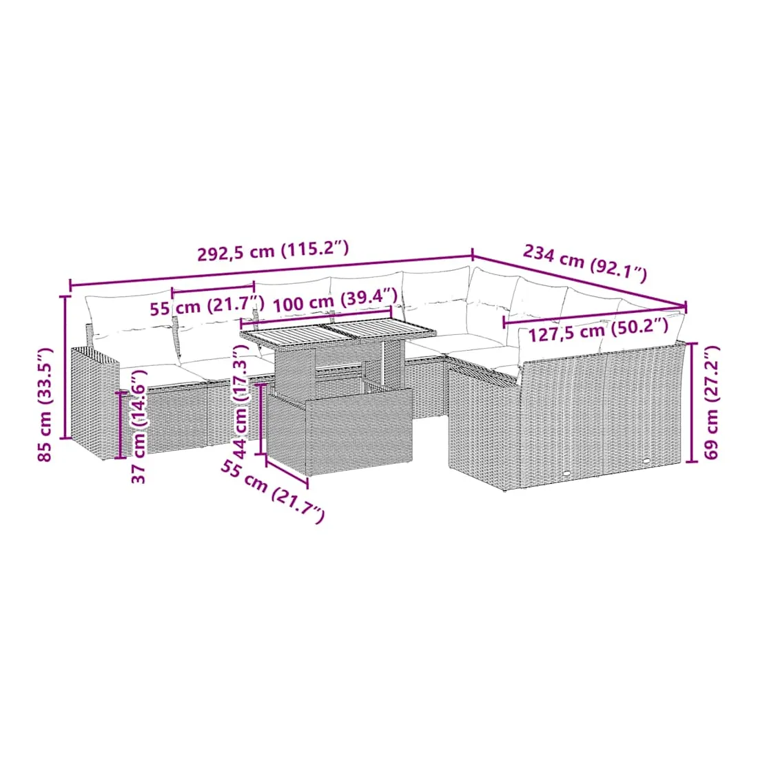 Cet ensemble de canapés de jardin est le complément parfait de votre arrière-cour, terrasse ou patio, offrant un espace confortable et accueillant pour discuter avec la famille et les amis ou simplement se détendre et profiter de l'extérieur. Matériau durable : la résine tressée, également connue sous le nom de poly rotin, est un matériau synthétique solide et nécessitant peu d'entretien qui ressemble au rotin naturel. Il est léger, facile à nettoyer et couramment utilisé pour les meubles d'extérieur en raison de sa durabilité et de ses propriétés de résistance aux intempéries.Dessus de table réglable : le dessus de table peut être soulevé pour rendre la table plus haute, ce qui transforme la table d'extérieur d'une table basse à une table de salle à manger. Elle est parfaite pour recevoir des invités ou prendre des repas à l'extérieur.Expérience d'assise confortable : ce mobilier d'extérieur, doté de coussins épais, offre une expérience d'assise confortable.Housse amovible et lavable : ces coussins de siège sont dotés de housses amovibles pour un lavage et un entretien faciles.Conception modulaire : cet ensemble de meubles d'extérieur a une conception modulaire, ce qui le rend complètement flexible et facile à déplacer, afin que vous puissiez créer un agencement de meubles d'extérieur personnalisé. Bon à savoir :Pour que vos meubles d'extérieur restent beaux, nous vous recommandons de les protéger avec une housse imperméable.