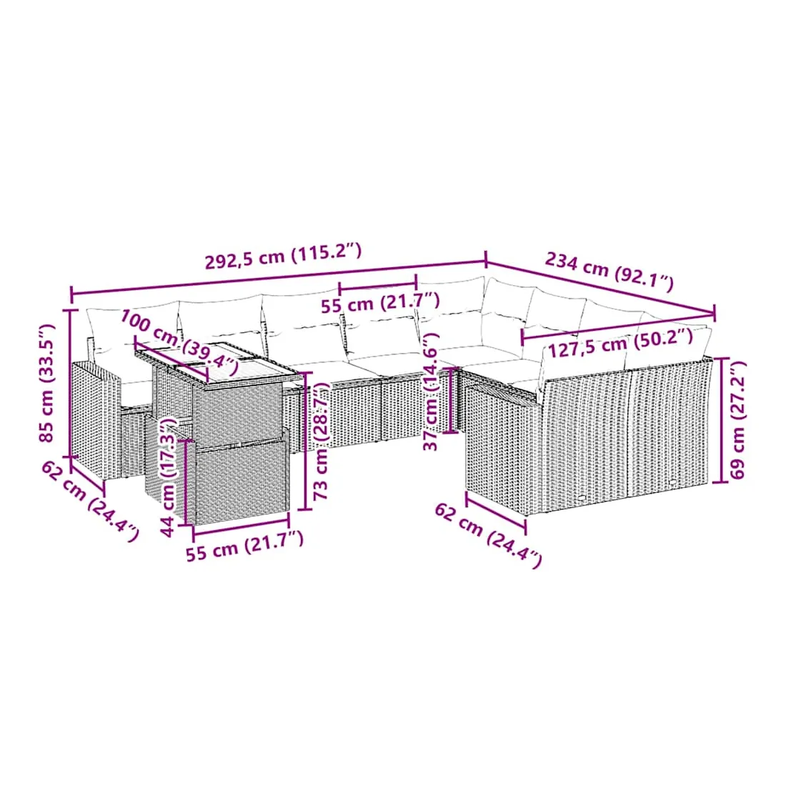 • 9 x coussin d'assise avec housse amovible et lavable
