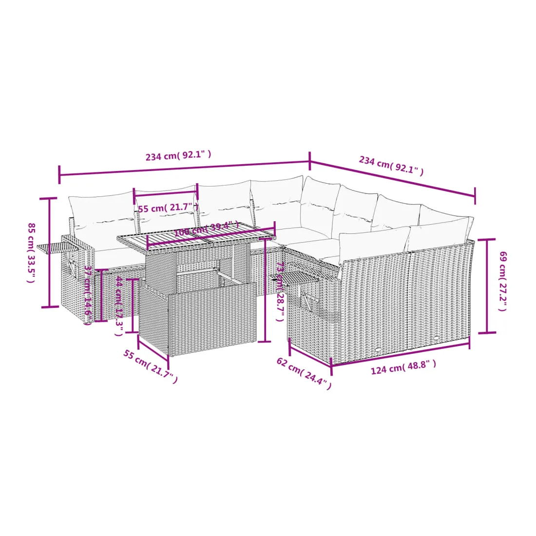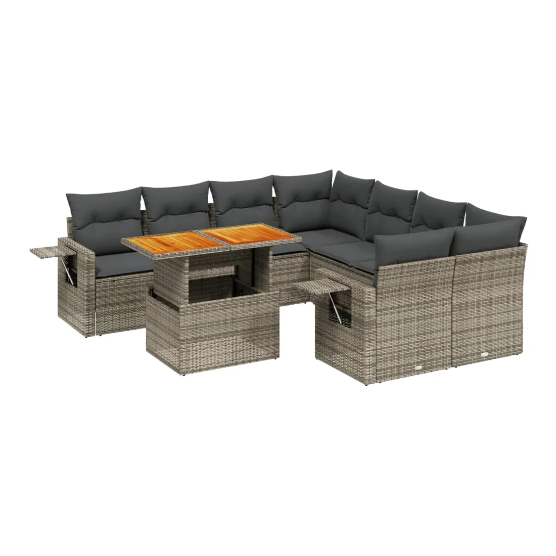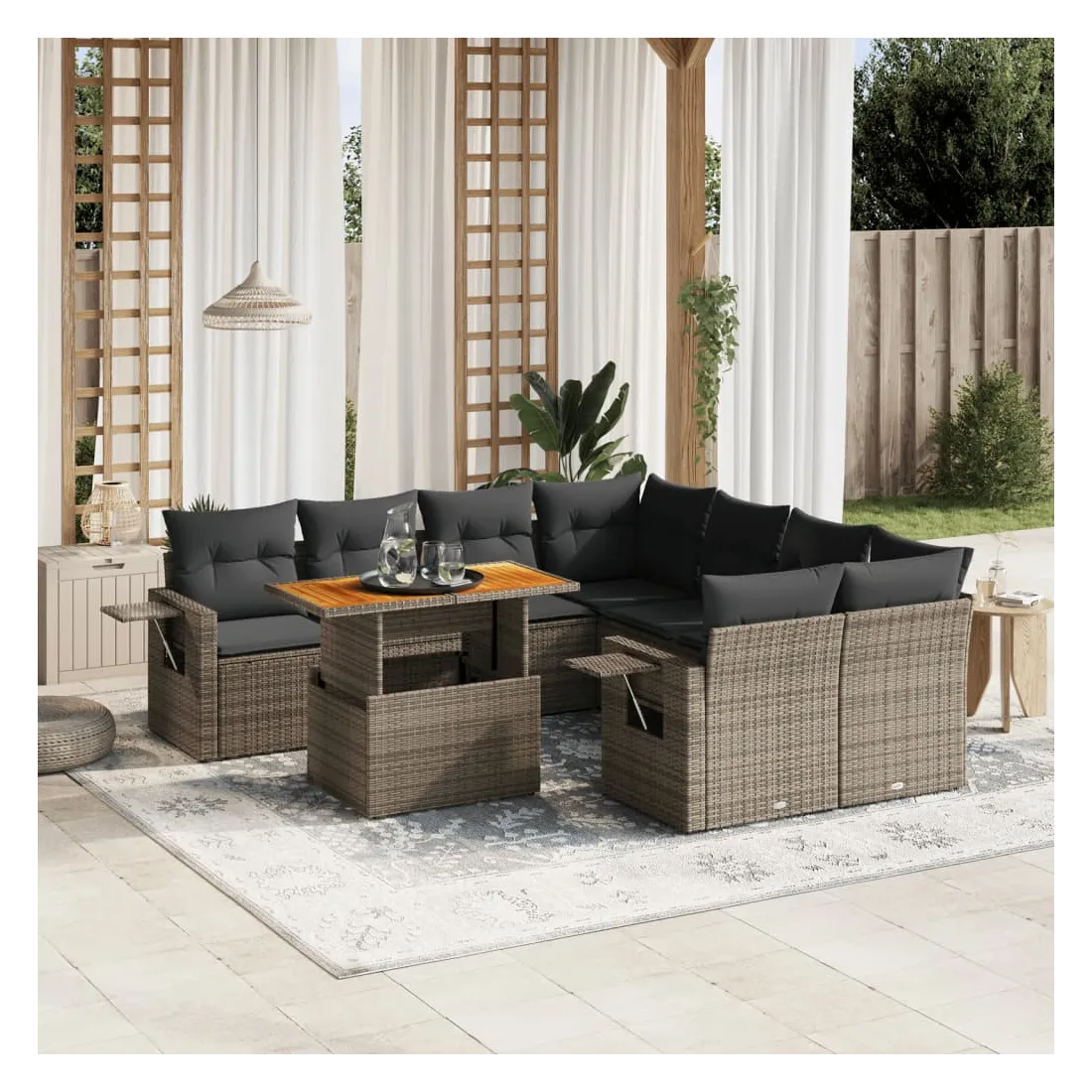 Cet ensemble de canapés de jardin est le complément parfait de votre arrière-cour, terrasse ou patio, offrant un espace confortable et accueillant pour discuter avec la famille et les amis ou simplement se détendre et profiter de l'extérieur. Matériau durable : la résine tressée, également connue sous le nom de poly rotin, est un matériau synthétique solide et nécessitant peu d'entretien qui ressemble au rotin naturel. Il est léger, facile à nettoyer et couramment utilisé pour les meubles d'extérieur en raison de sa durabilité et de ses propriétés de résistance aux intempéries.Dessus de table réglable : le dessus de table peut être soulevé pour rendre la table plus haute, ce qui transforme la table d'extérieur d'une table basse à une table de salle à manger. Elle est parfaite pour recevoir des invités ou prendre des repas à l'extérieur.Table d'appoint pratique : ce mobilier d'extérieur comprend une table d'appoint pliable avec un ressort à gaz sur les accoudoirs, offrant un endroit pratique pour garder vos essentiels à portée de main.Housse amovible et lavable : ces coussins de siège sont dotés de housses amovibles pour un lavage et un entretien faciles.Conception modulaire : cet ensemble de meubles d'extérieur a une conception modulaire, ce qui le rend complètement flexible et facile à déplacer, afin que vous puissiez créer un agencement de meubles d'extérieur personnalisé. Bon à savoir :Pour que vos meubles d'extérieur restent beaux, nous vous recommandons de les protéger avec une housse imperméable.