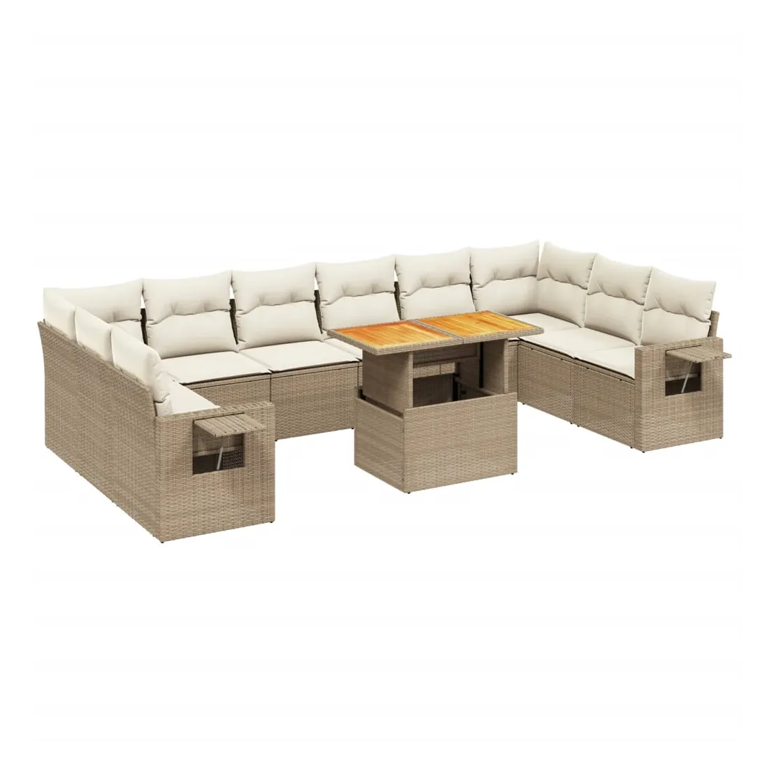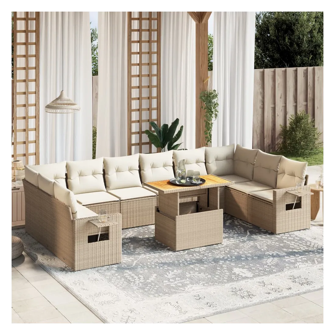 Cet ensemble de canapés de jardin est le complément parfait de votre arrière-cour, terrasse ou patio, offrant un espace confortable et accueillant pour discuter avec la famille et les amis ou simplement se détendre et profiter de l'extérieur. Matériau durable : la résine tressée, également connue sous le nom de poly rotin, est un matériau synthétique solide et nécessitant peu d'entretien qui ressemble au rotin naturel. Il est léger, facile à nettoyer et couramment utilisé pour les meubles d'extérieur en raison de sa durabilité et de ses propriétés de résistance aux intempéries.Dessus de table réglable : le dessus de table peut être soulevé pour rendre la table plus haute, ce qui transforme la table d'extérieur d'une table basse à une table de salle à manger. Elle est parfaite pour recevoir des invités ou prendre des repas à l'extérieur.Table d'appoint pratique : ce mobilier d'extérieur comprend une table d'appoint pliable avec un ressort à gaz sur les accoudoirs, offrant un endroit pratique pour garder vos essentiels à portée de main.Housse amovible et lavable : ces coussins de siège sont dotés de housses amovibles pour un lavage et un entretien faciles.Conception modulaire : cet ensemble de meubles d'extérieur a une conception modulaire, ce qui le rend complètement flexible et facile à déplacer, afin que vous puissiez créer un agencement de meubles d'extérieur personnalisé. Bon à savoir :Pour que vos meubles d'extérieur restent beaux, nous vous recommandons de les protéger avec une housse imperméable.
