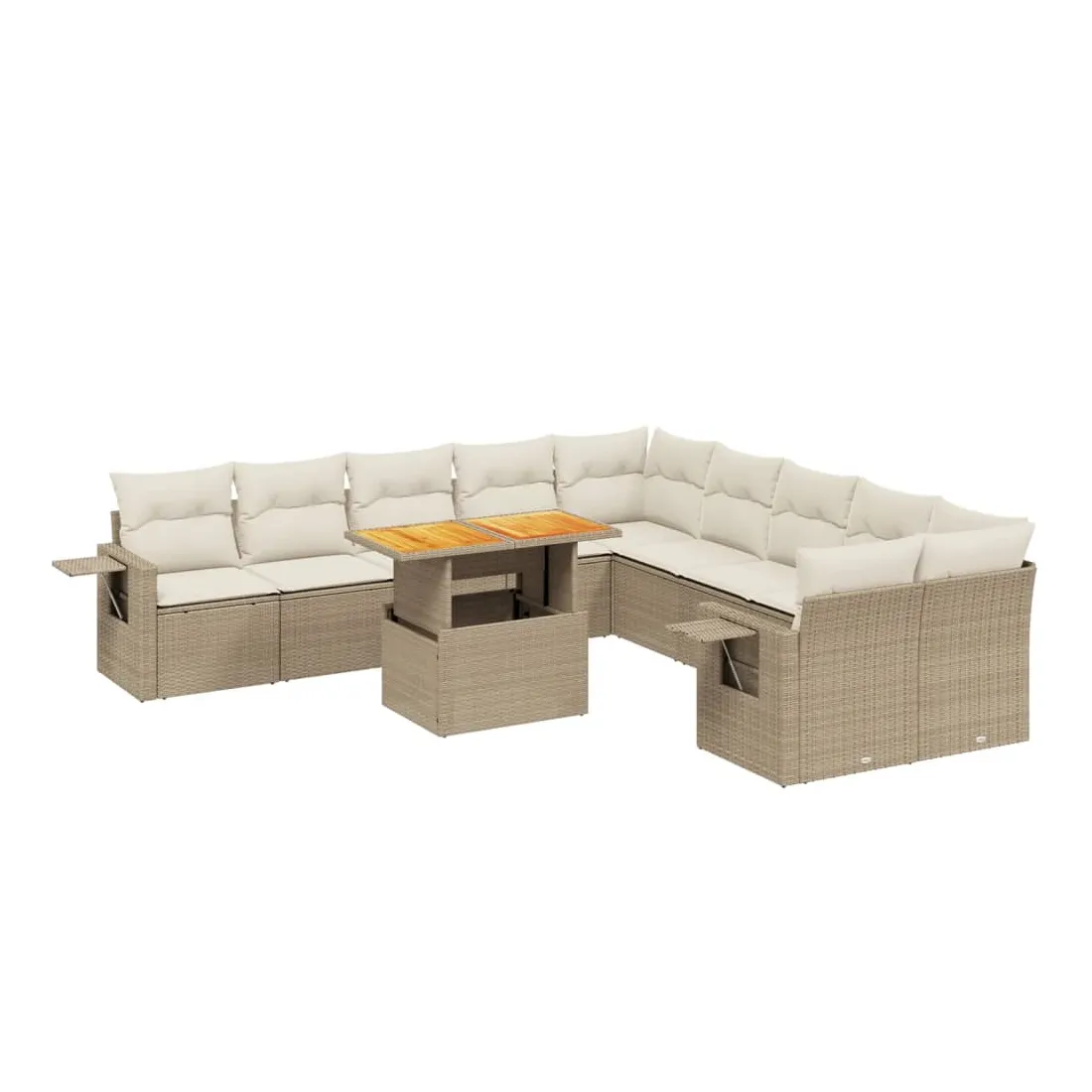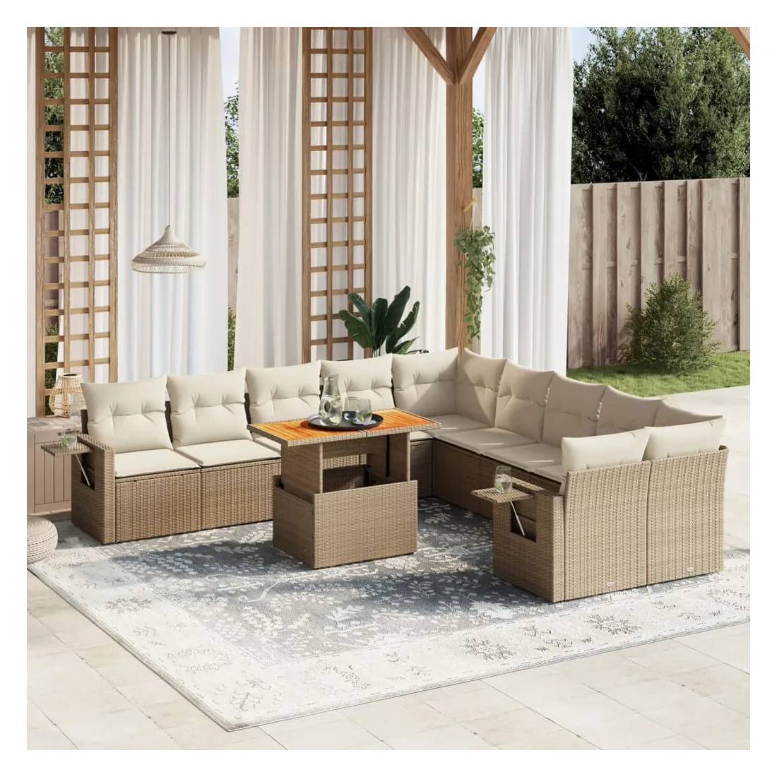 Cet ensemble de canapés de jardin est le complément parfait de votre arrière-cour, terrasse ou patio, offrant un espace confortable et accueillant pour discuter avec la famille et les amis ou simplement se détendre et profiter de l'extérieur. Matériau durable : la résine tressée, également connue sous le nom de poly rotin, est un matériau synthétique solide et nécessitant peu d'entretien qui ressemble au rotin naturel. Il est léger, facile à nettoyer et couramment utilisé pour les meubles d'extérieur en raison de sa durabilité et de ses propriétés de résistance aux intempéries.Dessus de table réglable : le dessus de table peut être soulevé pour rendre la table plus haute, ce qui transforme la table d'extérieur d'une table basse à une table de salle à manger. Elle est parfaite pour recevoir des invités ou prendre des repas à l'extérieur.Table d'appoint pratique : ce mobilier d'extérieur comprend une table d'appoint pliable avec un ressort à gaz sur les accoudoirs, offrant un endroit pratique pour garder vos essentiels à portée de main.Housse amovible et lavable : ces coussins de siège sont dotés de housses amovibles pour un lavage et un entretien faciles.Conception modulaire : cet ensemble de meubles d'extérieur a une conception modulaire, ce qui le rend complètement flexible et facile à déplacer, afin que vous puissiez créer un agencement de meubles d'extérieur personnalisé. Bon à savoir :Pour que vos meubles d'extérieur restent beaux, nous vous recommandons de les protéger avec une housse imperméable.