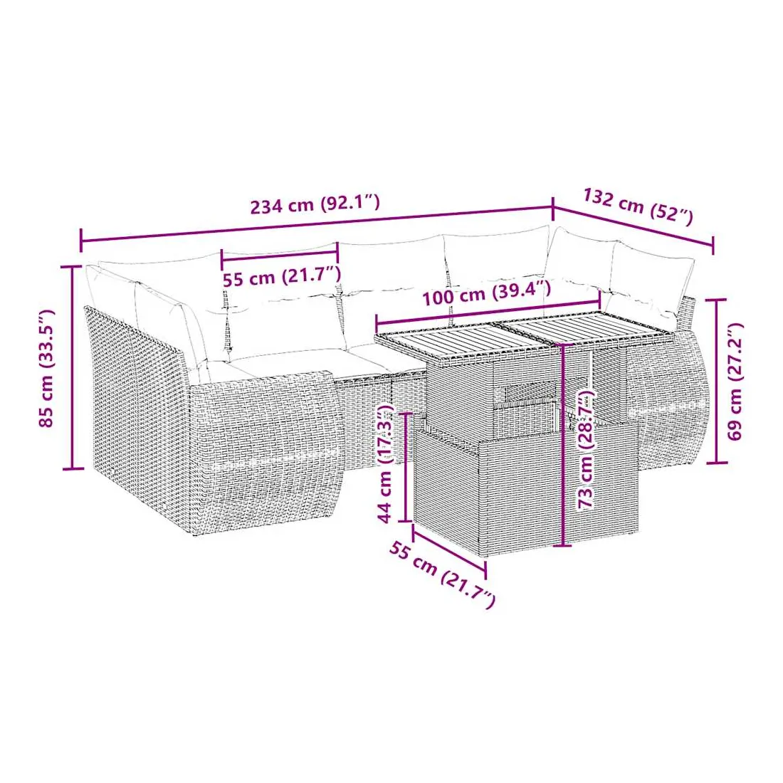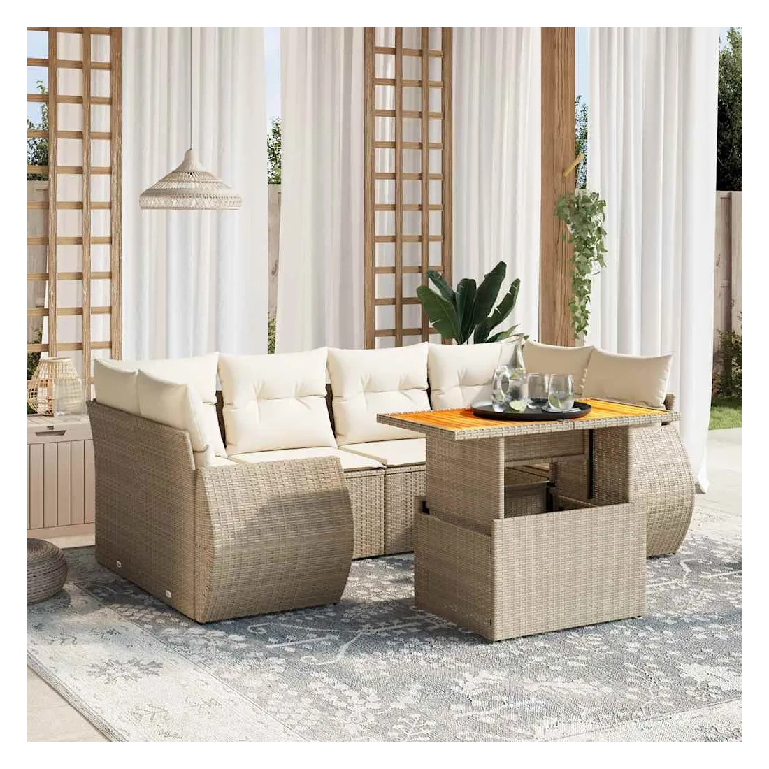 Cet ensemble de canapés de jardin est le complément parfait de votre arrière-cour, terrasse ou patio, offrant un espace confortable et accueillant pour discuter avec la famille et les amis ou simplement se détendre et profiter de l'extérieur. Matériau durable : la résine tressée, également connue sous le nom de poly rotin, est un matériau synthétique solide et nécessitant peu d'entretien qui ressemble au rotin naturel. Il est léger, facile à nettoyer et couramment utilisé pour les meubles d'extérieur en raison de sa durabilité et de ses propriétés de résistance aux intempéries.Dessus de table réglable : le dessus de table peut être soulevé pour rendre la table plus haute, ce qui transforme la table d'extérieur d'une table basse à une table de salle à manger. Elle est parfaite pour recevoir des invités ou prendre des repas à l'extérieur.Expérience d'assise confortable : ce mobilier d'extérieur, doté de coussins épais, offre une expérience d'assise confortable.Housse amovible et lavable : ces coussins de siège sont dotés de housses amovibles pour un lavage et un entretien faciles.Conception modulaire : cet ensemble de meubles d'extérieur a une conception modulaire, ce qui le rend complètement flexible et facile à déplacer, afin que vous puissiez créer un agencement de meubles d'extérieur personnalisé. Bon à savoir :Pour que vos meubles d'extérieur restent beaux, nous vous recommandons de les protéger avec une housse imperméable.