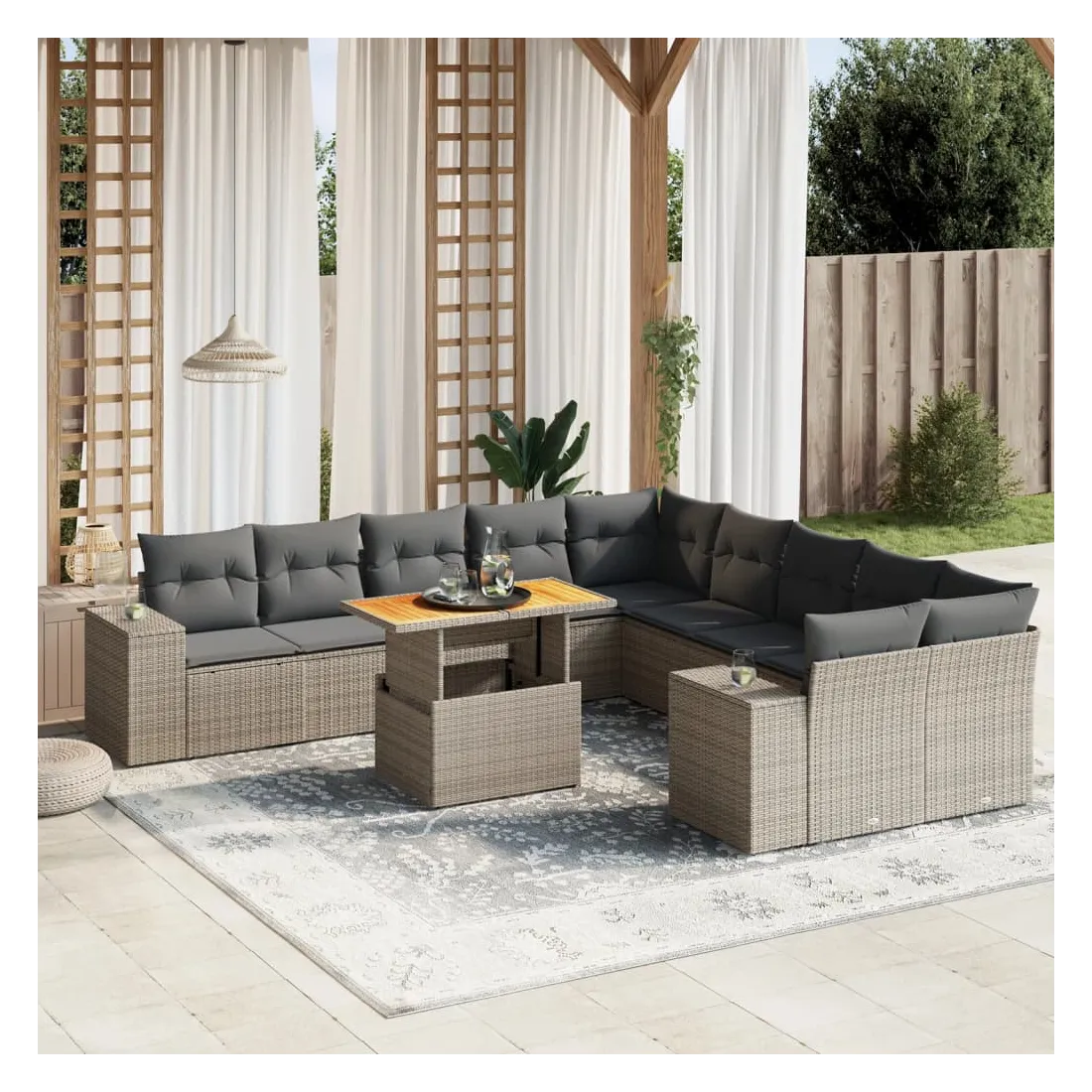 Cet ensemble de canapés de jardin est le complément parfait de votre arrière-cour, terrasse ou patio, offrant un espace confortable et accueillant pour discuter avec la famille et les amis ou simplement se détendre et profiter de l'extérieur. Matériau durable : la résine tressée, également connue sous le nom de poly rotin, est un matériau synthétique solide et nécessitant peu d'entretien qui ressemble au rotin naturel. Il est léger, facile à nettoyer et couramment utilisé pour les meubles d'extérieur en raison de sa durabilité et de ses propriétés de résistance aux intempéries.Dessus de table réglable : le dessus de table peut être soulevé pour rendre la table plus haute, ce qui transforme la table d'extérieur d'une table basse à une table de salle à manger. Elle est parfaite pour recevoir des invités ou prendre des repas à l'extérieur.Expérience d'assise confortable : ce mobilier d'extérieur, doté de coussins épais, offre une expérience d'assise confortable.Housse amovible et lavable : ces coussins de siège sont dotés de housses amovibles pour un lavage et un entretien faciles.Conception modulaire : cet ensemble de meubles d'extérieur a une conception modulaire, ce qui le rend complètement flexible et facile à déplacer, afin que vous puissiez créer un agencement de meubles d'extérieur personnalisé. Bon à savoir :Pour que vos meubles d'extérieur restent beaux, nous vous recommandons de les protéger avec une housse imperméable.