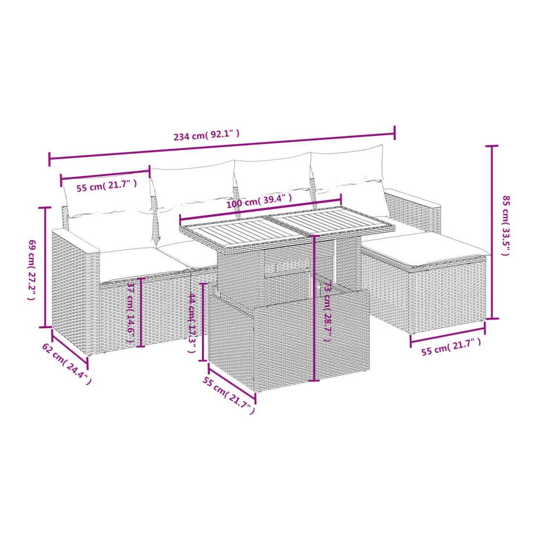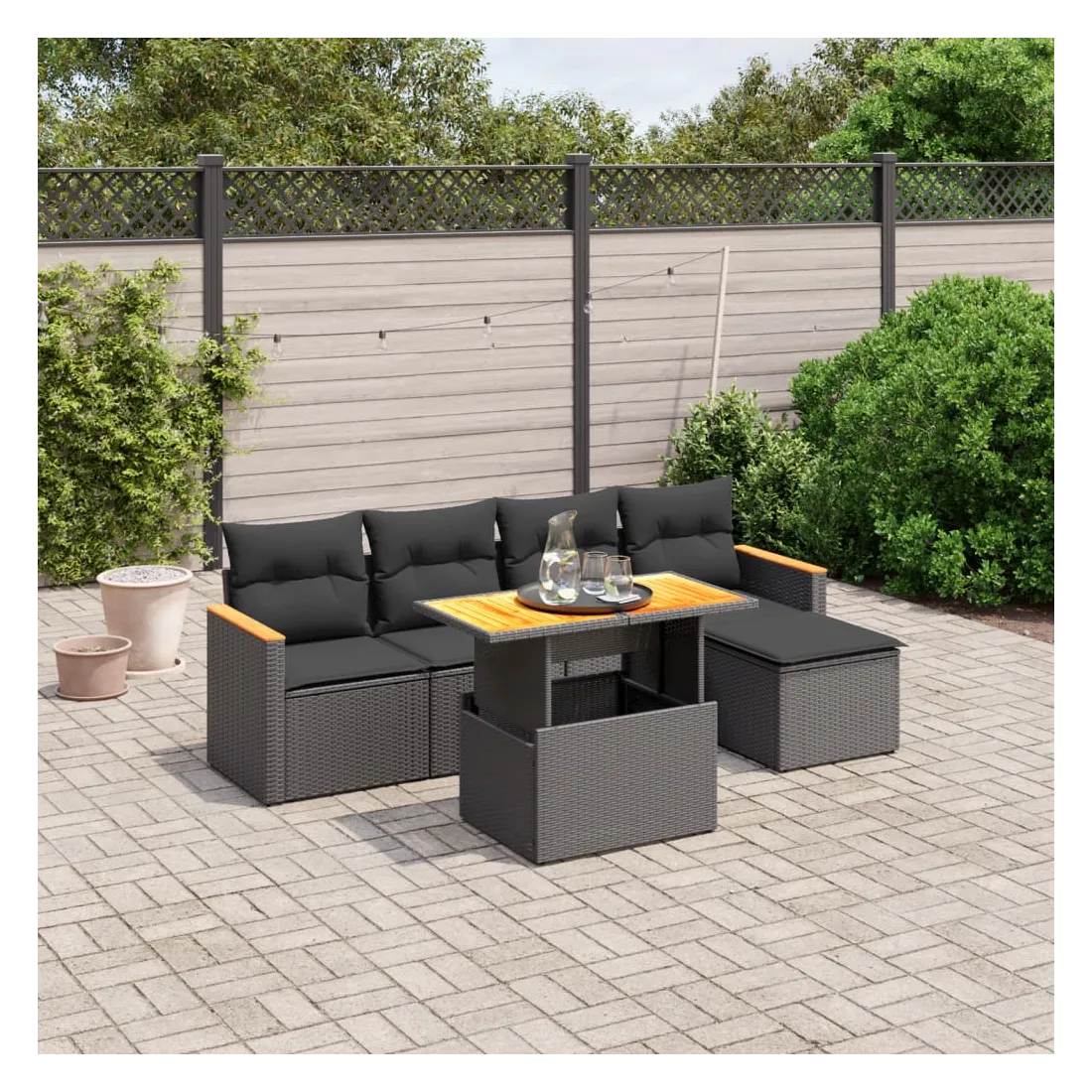 Cet ensemble de canapés de jardin est le complément parfait de votre arrière-cour, terrasse ou patio, offrant un espace confortable et accueillant pour discuter avec la famille et les amis ou simplement se détendre et profiter de l'extérieur. Matériau durable : la résine tressée, également connue sous le nom de poly rotin, est un matériau synthétique solide et nécessitant peu d'entretien qui ressemble au rotin naturel. Il est léger, facile à nettoyer et couramment utilisé pour les meubles d'extérieur en raison de sa durabilité et de ses propriétés de résistance aux intempéries.Dessus de table réglable : le dessus de table peut être soulevé pour rendre la table plus haute, ce qui transforme la table d'extérieur d'une table basse à une table de salle à manger. Elle est parfaite pour recevoir des invités ou prendre des repas à l'extérieur.Expérience d'assise confortable : ce mobilier d'extérieur, doté de coussins épais, offre une expérience d'assise confortable.Housse amovible et lavable : ces coussins de siège sont dotés de housses amovibles pour un lavage et un entretien faciles.Conception modulaire : cet ensemble de meubles d'extérieur a une conception modulaire, ce qui le rend complètement flexible et facile à déplacer, afin que vous puissiez créer un agencement de meubles d'extérieur personnalisé. Bon à savoir :Pour que vos meubles d'extérieur restent beaux, nous vous recommandons de les protéger avec une housse imperméable.