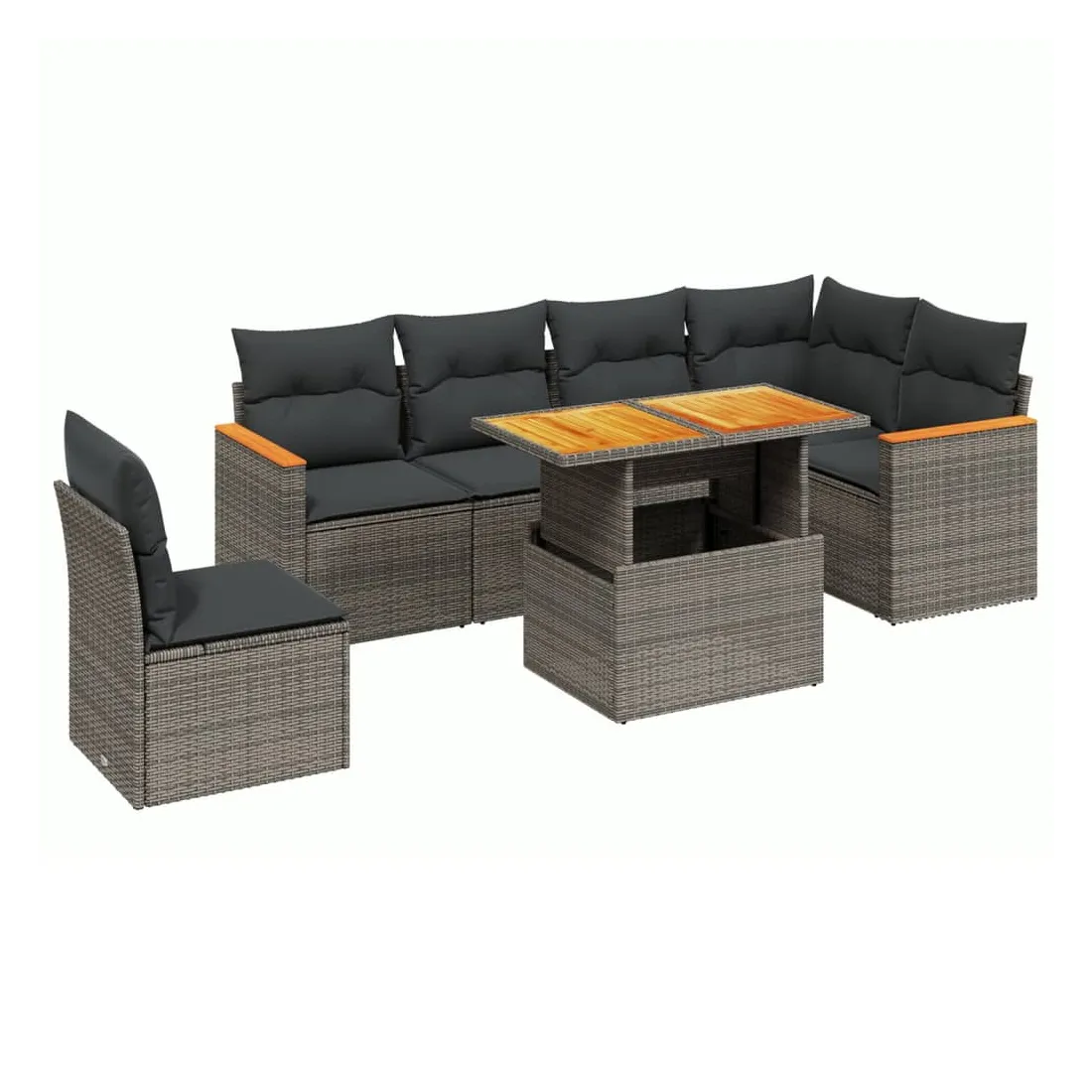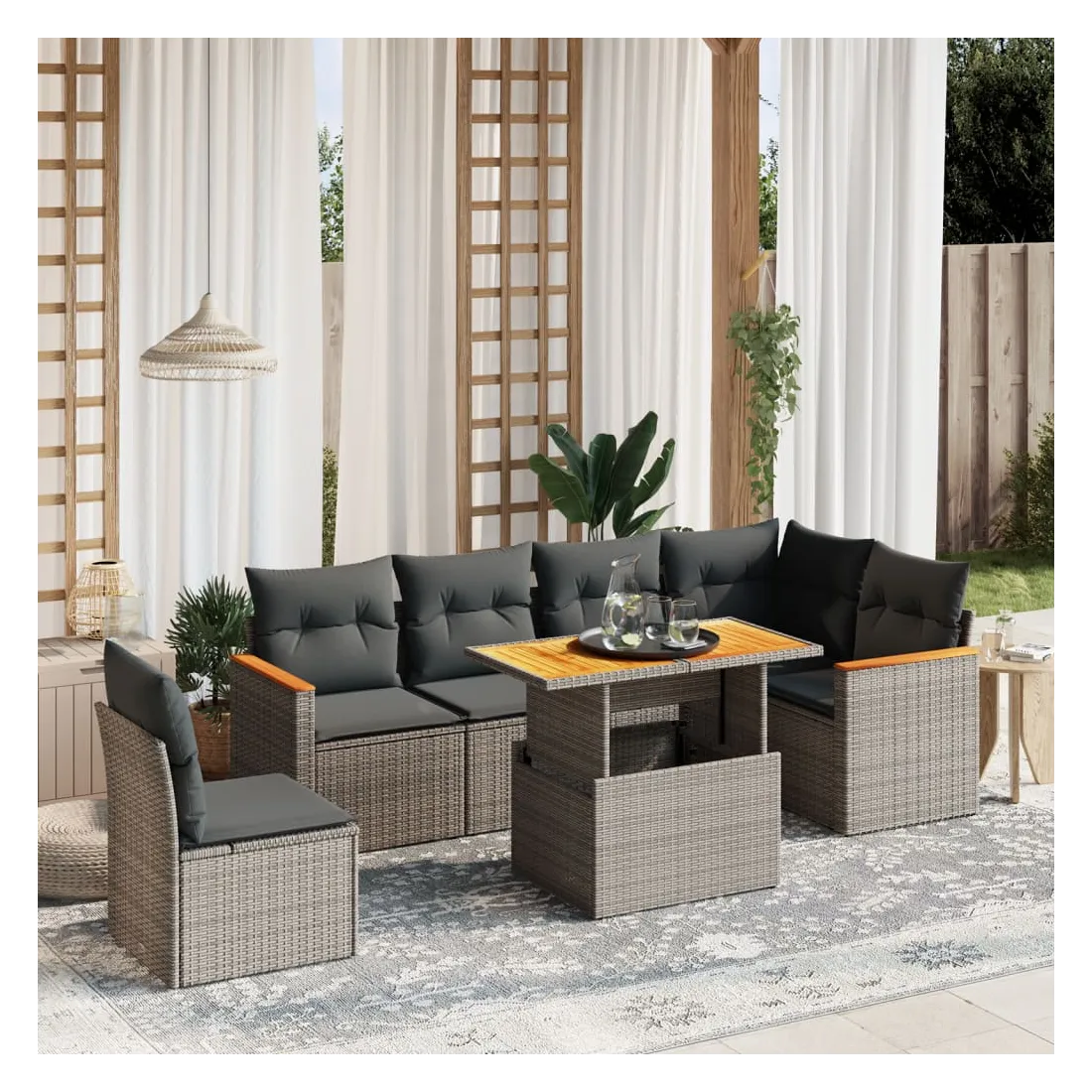 Cet ensemble de canapés de jardin est le complément parfait de votre arrière-cour, terrasse ou patio, offrant un espace confortable et accueillant pour discuter avec la famille et les amis ou simplement se détendre et profiter de l'extérieur. Matériau durable : la résine tressée, également connue sous le nom de poly rotin, est un matériau synthétique solide et nécessitant peu d'entretien qui ressemble au rotin naturel. Il est léger, facile à nettoyer et couramment utilisé pour les meubles d'extérieur en raison de sa durabilité et de ses propriétés de résistance aux intempéries.Dessus de table réglable : le dessus de table peut être soulevé pour rendre la table plus haute, ce qui transforme la table d'extérieur d'une table basse à une table de salle à manger. Elle est parfaite pour recevoir des invités ou prendre des repas à l'extérieur.Expérience d'assise confortable : ce mobilier d'extérieur, doté de coussins épais, offre une expérience d'assise confortable.Housse amovible et lavable : ces coussins de siège sont dotés de housses amovibles pour un lavage et un entretien faciles.Conception modulaire : cet ensemble de meubles d'extérieur a une conception modulaire, ce qui le rend complètement flexible et facile à déplacer, afin que vous puissiez créer un agencement de meubles d'extérieur personnalisé. Bon à savoir :Pour que vos meubles d'extérieur restent beaux, nous vous recommandons de les protéger avec une housse imperméable.