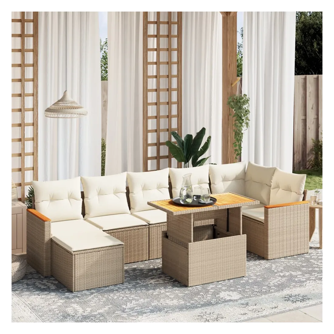 Cet ensemble de canapés de jardin est le complément parfait de votre arrière-cour, terrasse ou patio, offrant un espace confortable et accueillant pour discuter avec la famille et les amis ou simplement se détendre et profiter de l'extérieur. Matériau durable : la résine tressée, également connue sous le nom de poly rotin, est un matériau synthétique solide et nécessitant peu d'entretien qui ressemble au rotin naturel. Il est léger, facile à nettoyer et couramment utilisé pour les meubles d'extérieur en raison de sa durabilité et de ses propriétés de résistance aux intempéries.Dessus de table réglable : le dessus de table peut être soulevé pour rendre la table plus haute, ce qui transforme la table d'extérieur d'une table basse à une table de salle à manger. Elle est parfaite pour recevoir des invités ou prendre des repas à l'extérieur.Expérience d'assise confortable : ce mobilier d'extérieur, doté de coussins épais, offre une expérience d'assise confortable.Housse amovible et lavable : ces coussins de siège sont dotés de housses amovibles pour un lavage et un entretien faciles.Conception modulaire : cet ensemble de meubles d'extérieur a une conception modulaire, ce qui le rend complètement flexible et facile à déplacer, afin que vous puissiez créer un agencement de meubles d'extérieur personnalisé. Bon à savoir :Pour que vos meubles d'extérieur restent beaux, nous vous recommandons de les protéger avec une housse imperméable.