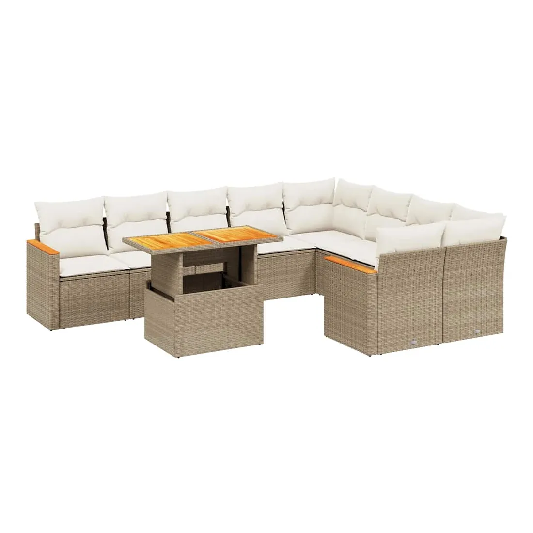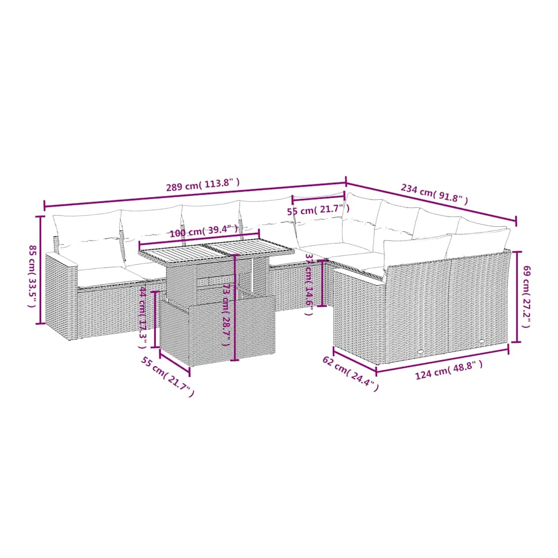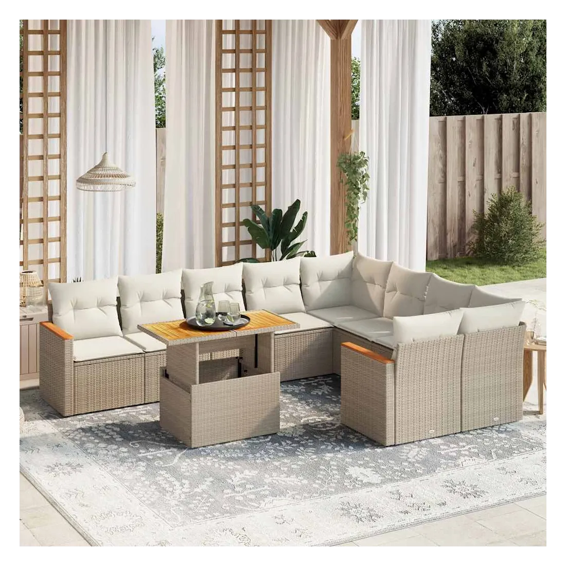 Cet ensemble de canapés de jardin est le complément parfait de votre arrière-cour, terrasse ou patio, offrant un espace confortable et accueillant pour discuter avec la famille et les amis ou simplement se détendre et profiter de l'extérieur. Matériau durable : la résine tressée, également connue sous le nom de poly rotin, est un matériau synthétique solide et nécessitant peu d'entretien qui ressemble au rotin naturel. Il est léger, facile à nettoyer et couramment utilisé pour les meubles d'extérieur en raison de sa durabilité et de ses propriétés de résistance aux intempéries.Dessus de table réglable : le dessus de table peut être soulevé pour rendre la table plus haute, ce qui transforme la table d'extérieur d'une table basse à une table de salle à manger. Elle est parfaite pour recevoir des invités ou prendre des repas à l'extérieur.Expérience d'assise confortable : ce mobilier d'extérieur, doté de coussins épais, offre une expérience d'assise confortable.Housse amovible et lavable : ces coussins de siège sont dotés de housses amovibles pour un lavage et un entretien faciles.Conception modulaire : cet ensemble de meubles d'extérieur a une conception modulaire, ce qui le rend complètement flexible et facile à déplacer, afin que vous puissiez créer un agencement de meubles d'extérieur personnalisé. Bon à savoir :Pour que vos meubles d'extérieur restent beaux, nous vous recommandons de les protéger avec une housse imperméable.