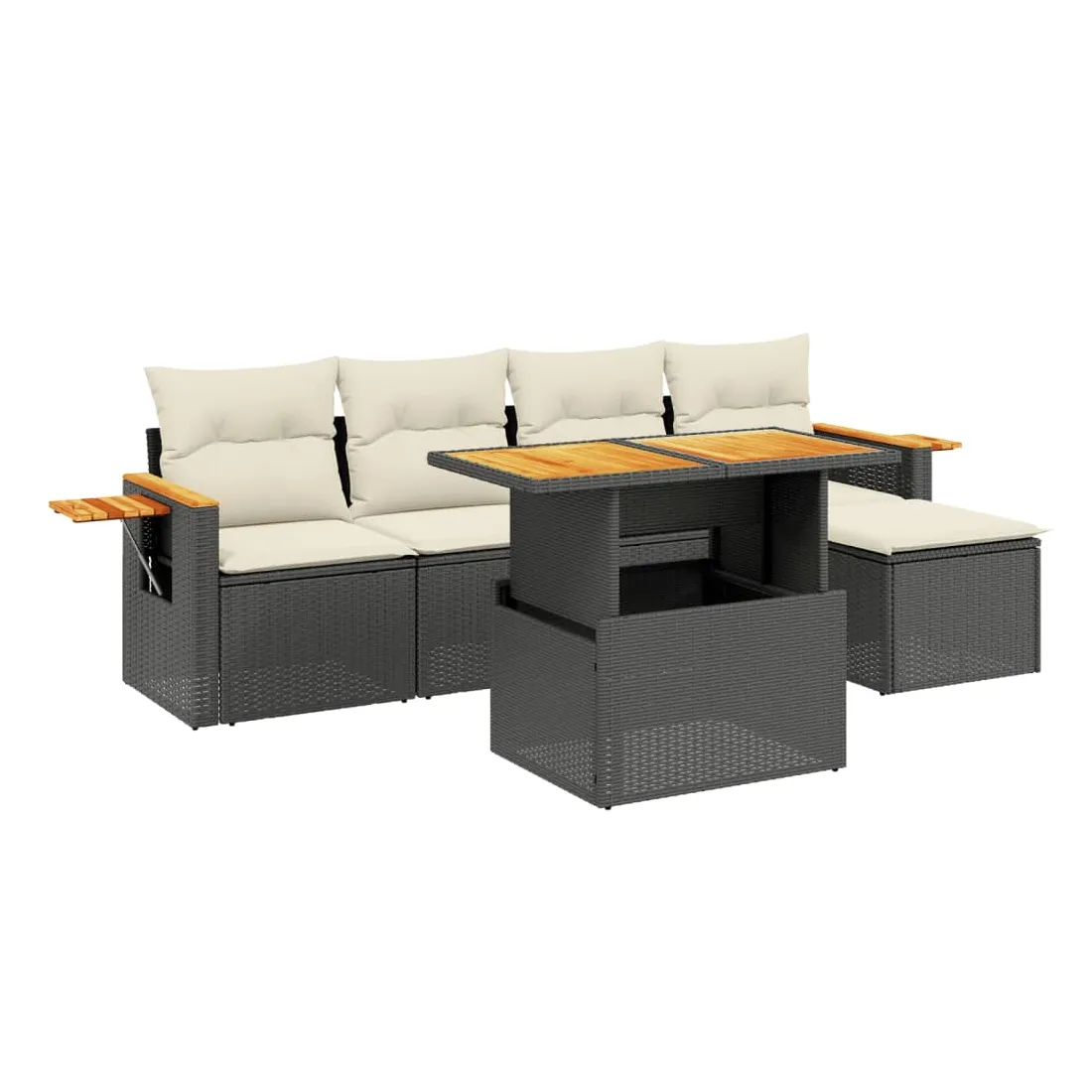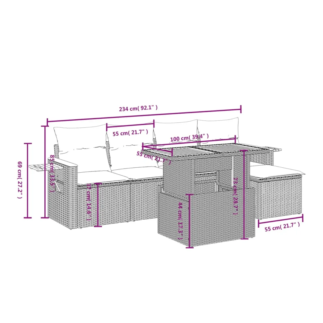Cet ensemble de canapés de jardin est le complément parfait de votre arrière-cour, terrasse ou patio, offrant un espace confortable et accueillant pour discuter avec la famille et les amis ou simplement se détendre et profiter de l'extérieur. Matériau durable : la résine tressée, également connue sous le nom de poly rotin, est un matériau synthétique solide et nécessitant peu d'entretien qui ressemble au rotin naturel. Il est léger, facile à nettoyer et couramment utilisé pour les meubles d'extérieur en raison de sa durabilité et de ses propriétés de résistance aux intempéries.Dessus de table réglable : le dessus de table peut être soulevé pour rendre la table plus haute, ce qui transforme la table d'extérieur d'une table basse à une table de salle à manger. Elle est parfaite pour recevoir des invités ou prendre des repas à l'extérieur.Table d'appoint pratique : ce mobilier d'extérieur comprend une table d'appoint pliable avec un ressort à gaz sur les accoudoirs, offrant un endroit pratique pour garder vos essentiels à portée de main.Housse amovible et lavable : ces coussins de siège sont dotés de housses amovibles pour un lavage et un entretien faciles.Conception modulaire : cet ensemble de meubles d'extérieur a une conception modulaire, ce qui le rend complètement flexible et facile à déplacer, afin que vous puissiez créer un agencement de meubles d'extérieur personnalisé. Bon à savoir :Pour que vos meubles d'extérieur restent beaux, nous vous recommandons de les protéger avec une housse imperméable.