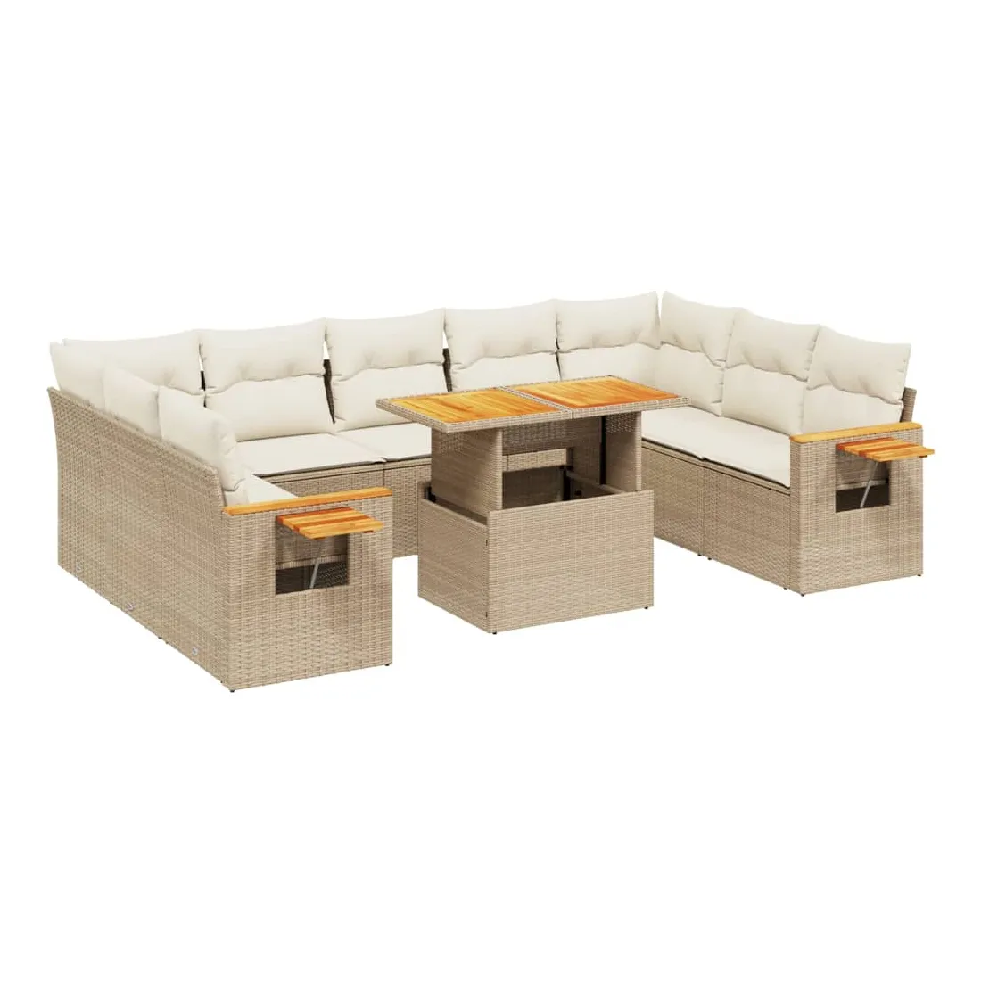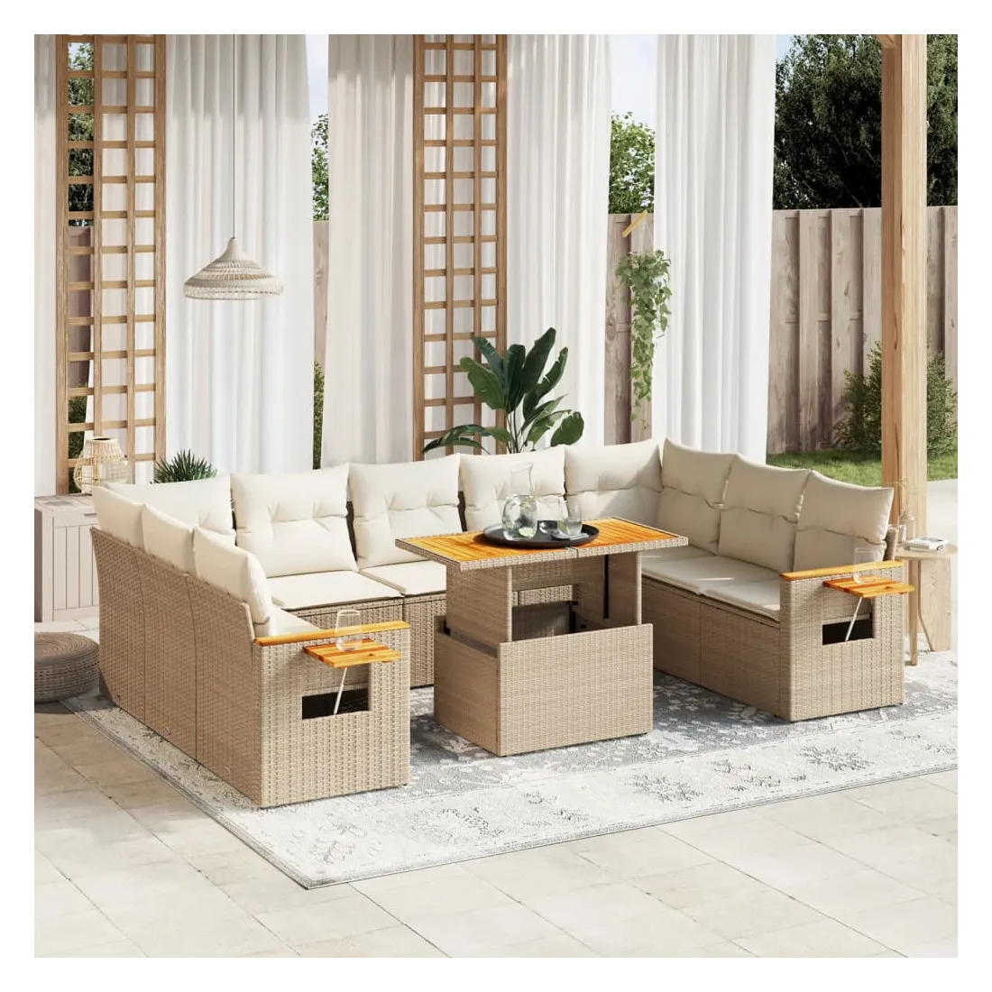 Cet ensemble de canapés de jardin est le complément parfait de votre arrière-cour, terrasse ou patio, offrant un espace confortable et accueillant pour discuter avec la famille et les amis ou simplement se détendre et profiter de l'extérieur. Matériau durable : la résine tressée, également connue sous le nom de poly rotin, est un matériau synthétique solide et nécessitant peu d'entretien qui ressemble au rotin naturel. Il est léger, facile à nettoyer et couramment utilisé pour les meubles d'extérieur en raison de sa durabilité et de ses propriétés de résistance aux intempéries.Dessus de table réglable : le dessus de table peut être soulevé pour rendre la table plus haute, ce qui transforme la table d'extérieur d'une table basse à une table de salle à manger. Elle est parfaite pour recevoir des invités ou prendre des repas à l'extérieur.Table d'appoint pratique : ce mobilier d'extérieur comprend une table d'appoint pliable avec un ressort à gaz sur les accoudoirs, offrant un endroit pratique pour garder vos essentiels à portée de main.Housse amovible et lavable : ces coussins de siège sont dotés de housses amovibles pour un lavage et un entretien faciles.Conception modulaire : cet ensemble de meubles d'extérieur a une conception modulaire, ce qui le rend complètement flexible et facile à déplacer, afin que vous puissiez créer un agencement de meubles d'extérieur personnalisé. Bon à savoir :Pour que vos meubles d'extérieur restent beaux, nous vous recommandons de les protéger avec une housse imperméable.