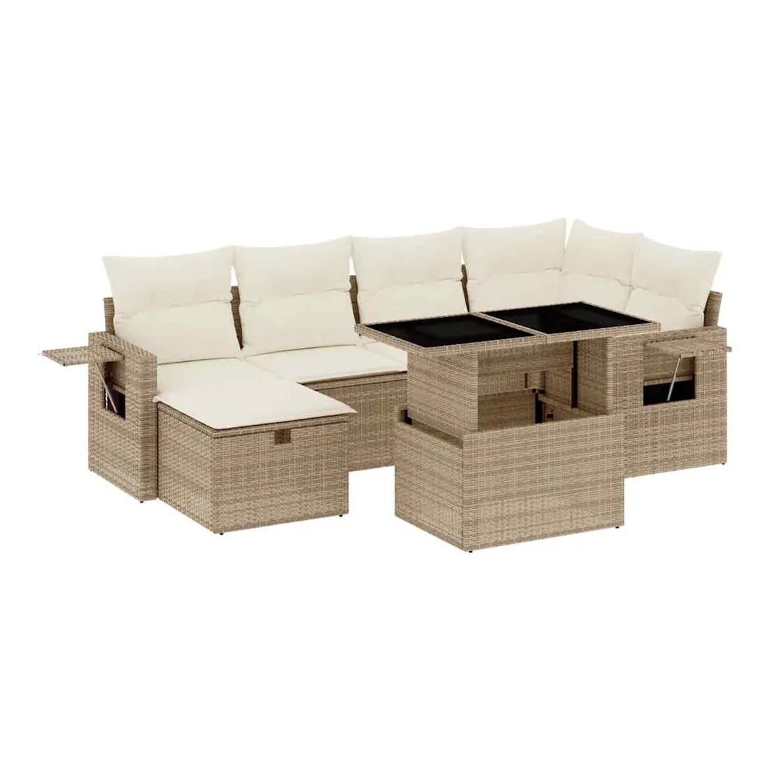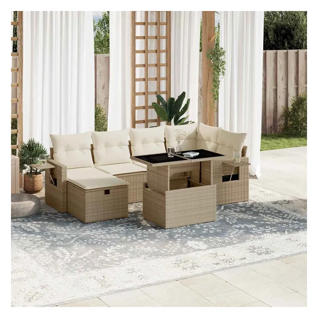 Cet ensemble de canapés de jardin est le complément parfait de votre arrière-cour, terrasse ou patio, offrant un espace confortable et accueillant pour discuter avec la famille et les amis ou simplement se détendre et profiter de l'extérieur. Matériau durable : la résine tressée, également connue sous le nom de poly rotin, est un matériau synthétique solide et nécessitant peu d'entretien qui ressemble au rotin naturel. Il est léger, facile à nettoyer et couramment utilisé pour les meubles d'extérieur en raison de sa durabilité et de ses propriétés de résistance aux intempéries.Dessus de table réglable : le dessus de table peut être soulevé pour rendre la table plus haute, ce qui transforme la table d'extérieur d'une table basse à une table de salle à manger. Elle est parfaite pour recevoir des invités ou prendre des repas à l'extérieur.Housse amovible et lavable : ces coussins de siège sont dotés de housses amovibles pour un lavage et un entretien faciles.Conception modulaire : cet ensemble de meubles d'extérieur a une conception modulaire, ce qui le rend complètement flexible et facile à déplacer, afin que vous puissiez créer un agencement de meubles d'extérieur personnalisé. Bon à savoir :Pour que vos meubles d'extérieur restent beaux, nous vous recommandons de les protéger avec une housse imperméable.