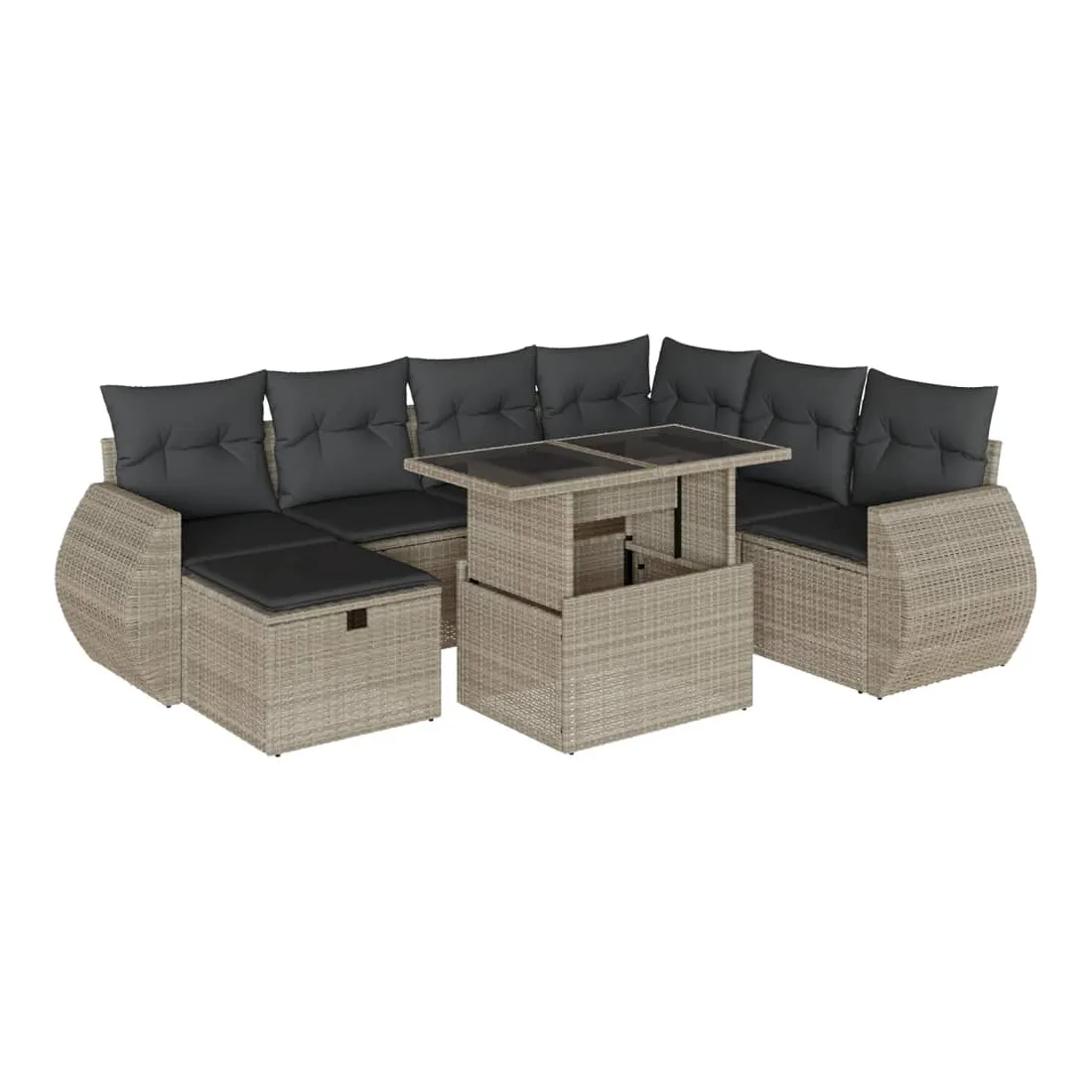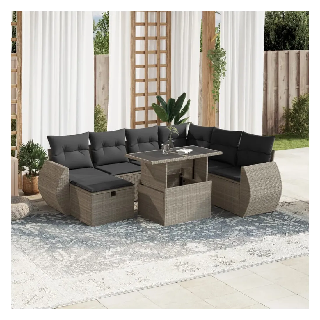 Cet ensemble de canapés de jardin est le complément parfait de votre arrière-cour, terrasse ou patio, offrant un espace confortable et accueillant pour discuter avec la famille et les amis ou simplement se détendre et profiter de l'extérieur. Matériau durable : la résine tressée, également connue sous le nom de poly rotin, est un matériau synthétique solide et nécessitant peu d'entretien qui ressemble au rotin naturel. Elle est légère, facile à nettoyer et couramment utilisée pour les meubles d'extérieur en raison de sa durabilité et de ses propriétés de résistance aux intempéries.Dessus de table réglable : le dessus de table peut être soulevé pour rendre la table plus haute, ce qui transforme la table d'extérieur d'une table basse à une table de salle à manger. Elle est parfaite pour recevoir des invités ou prendre des repas à l'extérieur.Dessus en verre : le dessus de la table d'extérieur est fabriqué en verre trempé solide et durable, ce qui le rend facile à nettoyer avec un chiffon humide et ajoute une touche d'élégance à votre espace extérieur.Housse amovible et lavable : ces coussins de siège sont dotés de housses amovibles pour un lavage et un entretien faciles.Conception modulaire : cet ensemble de meubles d'extérieur a une conception modulaire, ce qui le rend complètement flexible et facile à déplacer, afin que vous puissiez créer un agencement de meubles d'extérieur personnalisé. Bon à savoir :Pour que vos meubles d'extérieur restent beaux, nous vous recommandons de les protéger avec une housse imperméable.