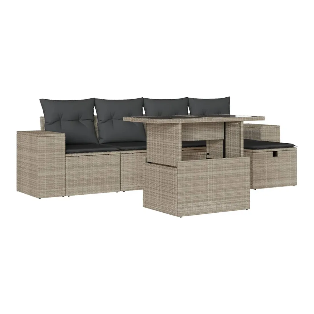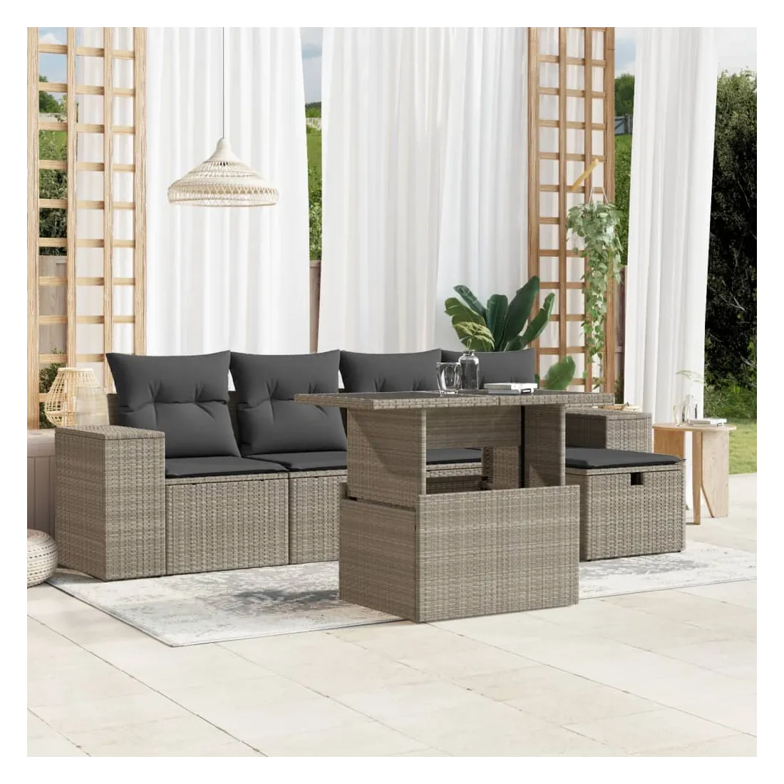 Cet ensemble de canapés de jardin est le complément parfait de votre arrière-cour, terrasse ou patio, offrant un espace confortable et accueillant pour discuter avec la famille et les amis ou simplement se détendre et profiter de l'extérieur. Matériau durable : la résine tressée, également connue sous le nom de poly rotin, est un matériau synthétique solide et nécessitant peu d'entretien qui ressemble au rotin naturel. Elle est légère, facile à nettoyer et couramment utilisée pour les meubles d'extérieur en raison de sa durabilité et de ses propriétés de résistance aux intempéries.Dessus de table réglable : le dessus de table peut être soulevé pour rendre la table plus haute, ce qui transforme la table d'extérieur d'une table basse à une table de salle à manger. Elle est parfaite pour recevoir des invités ou prendre des repas à l'extérieur.Dessus en verre : le dessus de la table d'extérieur est fabriqué en verre trempé solide et durable, ce qui le rend facile à nettoyer avec un chiffon humide et ajoute une touche d'élégance à votre espace extérieur.Housse amovible et lavable : ces coussins de siège sont dotés de housses amovibles pour un lavage et un entretien faciles.Conception modulaire : cet ensemble de meubles d'extérieur a une conception modulaire, ce qui le rend complètement flexible et facile à déplacer, afin que vous puissiez créer un agencement de meubles d'extérieur personnalisé. Bon à savoir :Pour que vos meubles d'extérieur restent beaux, nous vous recommandons de les protéger avec une housse imperméable.