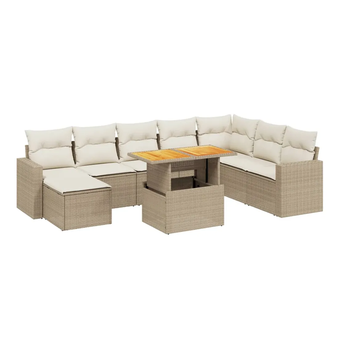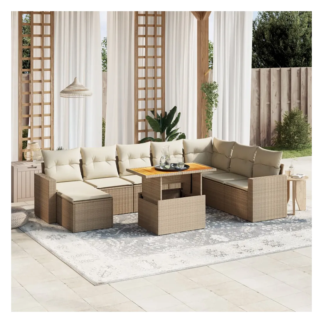 Cet ensemble de canapés de jardin est le complément parfait de votre arrière-cour, terrasse ou patio, offrant un espace confortable et accueillant pour discuter avec la famille et les amis ou simplement se détendre et profiter de l'extérieur. Matériau durable : la résine tressée, également connue sous le nom de poly rotin, est un matériau synthétique solide et nécessitant peu d'entretien qui ressemble au rotin naturel. Il est léger, facile à nettoyer et couramment utilisé pour les meubles d'extérieur en raison de sa durabilité et de ses propriétés de résistance aux intempéries.Dessus de table réglable : le dessus de table peut être soulevé pour rendre la table plus haute, ce qui transforme la table d'extérieur d'une table basse à une table de salle à manger. Elle est parfaite pour recevoir des invités ou prendre des repas à l'extérieur.Housse amovible et lavable : ces coussins de siège sont dotés de housses amovibles pour un lavage et un entretien faciles.Conception modulaire : cet ensemble de meubles d'extérieur a une conception modulaire, ce qui le rend complètement flexible et facile à déplacer, afin que vous puissiez créer un agencement de meubles d'extérieur personnalisé. Bon à savoir :Pour que vos meubles d'extérieur restent beaux, nous vous recommandons de les protéger avec une housse imperméable.