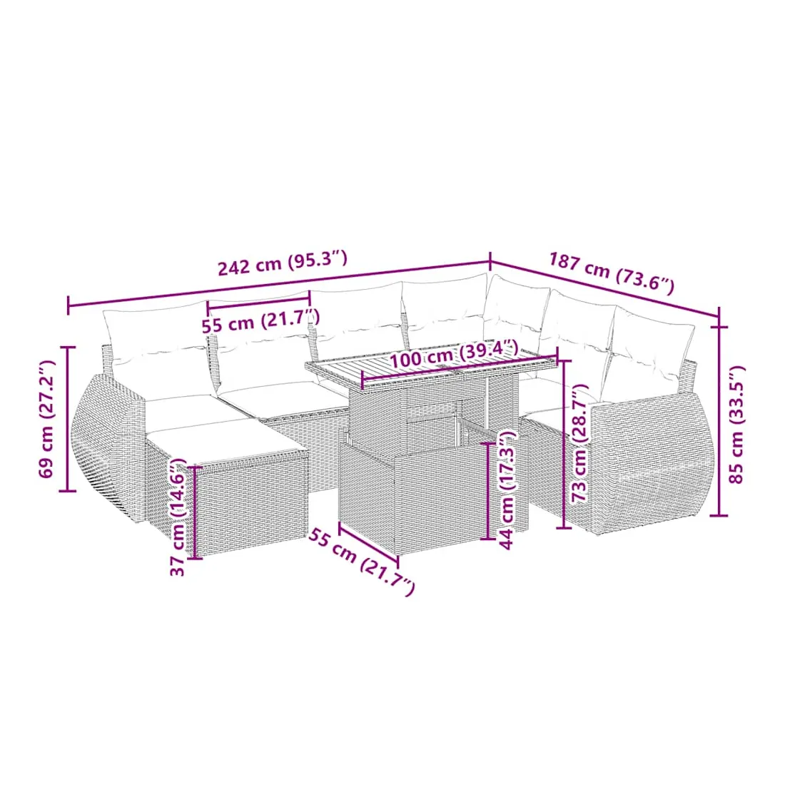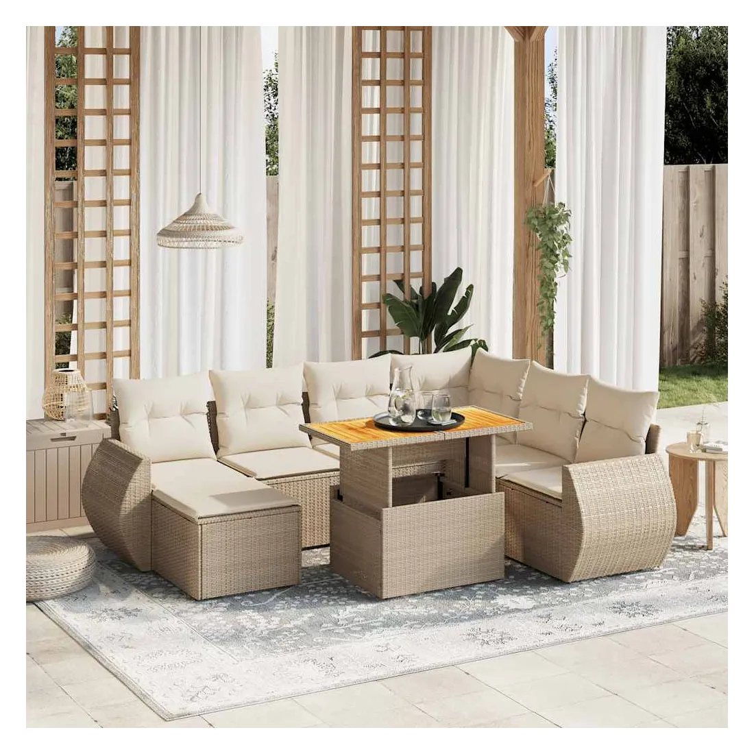 Cet ensemble de canapés de jardin est le complément parfait de votre arrière-cour, terrasse ou patio, offrant un espace confortable et accueillant pour discuter avec la famille et les amis ou simplement se détendre et profiter de l'extérieur. Matériau durable : la résine tressée, également connue sous le nom de poly rotin, est un matériau synthétique solide et nécessitant peu d'entretien qui ressemble au rotin naturel. Il est léger, facile à nettoyer et couramment utilisé pour les meubles d'extérieur en raison de sa durabilité et de ses propriétés de résistance aux intempéries.Dessus de table réglable : le dessus de table peut être soulevé pour rendre la table plus haute, ce qui transforme la table d'extérieur d'une table basse à une table de salle à manger. Elle est parfaite pour recevoir des invités ou prendre des repas à l'extérieur.Housse amovible et lavable : ces coussins de siège sont dotés de housses amovibles pour un lavage et un entretien faciles.Conception modulaire : cet ensemble de meubles d'extérieur a une conception modulaire, ce qui le rend complètement flexible et facile à déplacer, afin que vous puissiez créer un agencement de meubles d'extérieur personnalisé. Bon à savoir :Pour que vos meubles d'extérieur restent beaux, nous vous recommandons de les protéger avec une housse imperméable.