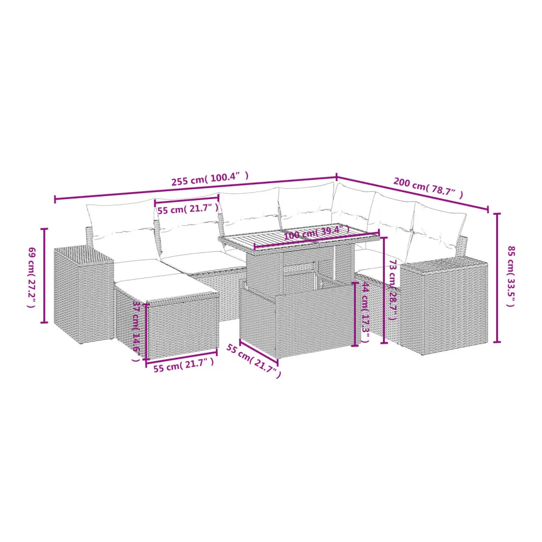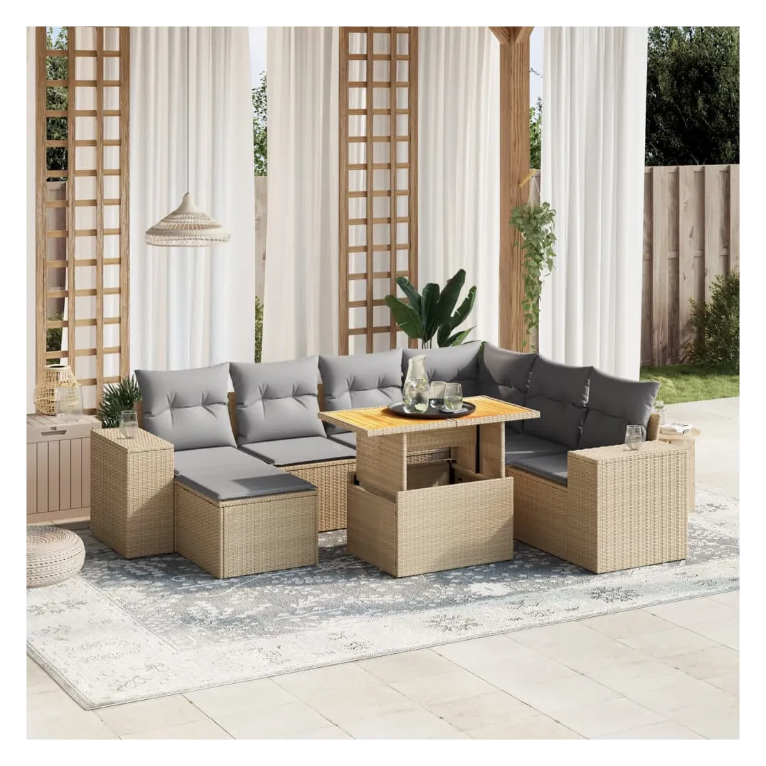 Cet ensemble de canapés de jardin est le complément parfait de votre arrière-cour, terrasse ou patio, offrant un espace confortable et accueillant pour discuter avec la famille et les amis ou simplement se détendre et profiter de l'extérieur. Matériau durable : la résine tressée, également connue sous le nom de poly rotin, est un matériau synthétique solide et nécessitant peu d'entretien qui ressemble au rotin naturel. Il est léger, facile à nettoyer et couramment utilisé pour les meubles d'extérieur en raison de sa durabilité et de ses propriétés de résistance aux intempéries.Dessus de table réglable : le dessus de table peut être soulevé pour rendre la table plus haute, ce qui transforme la table d'extérieur d'une table basse à une table de salle à manger. Elle est parfaite pour recevoir des invités ou prendre des repas à l'extérieur.Housse amovible et lavable : ces coussins de siège sont dotés de housses amovibles pour un lavage et un entretien faciles.Conception modulaire : cet ensemble de meubles d'extérieur a une conception modulaire, ce qui le rend complètement flexible et facile à déplacer, afin que vous puissiez créer un agencement de meubles d'extérieur personnalisé. Bon à savoir :Pour que vos meubles d'extérieur restent beaux, nous vous recommandons de les protéger avec une housse imperméable.