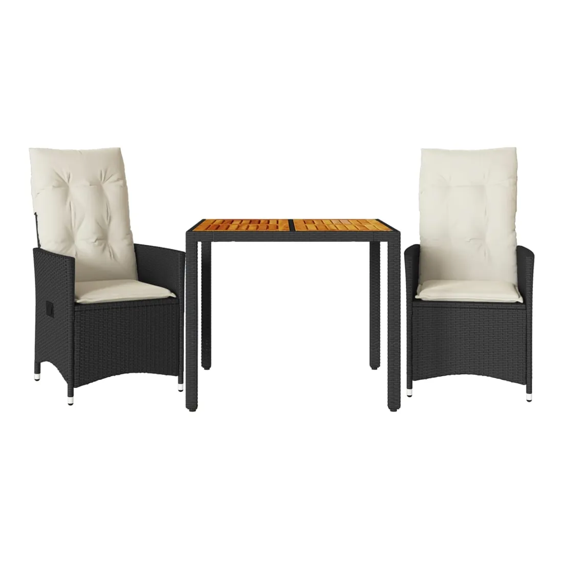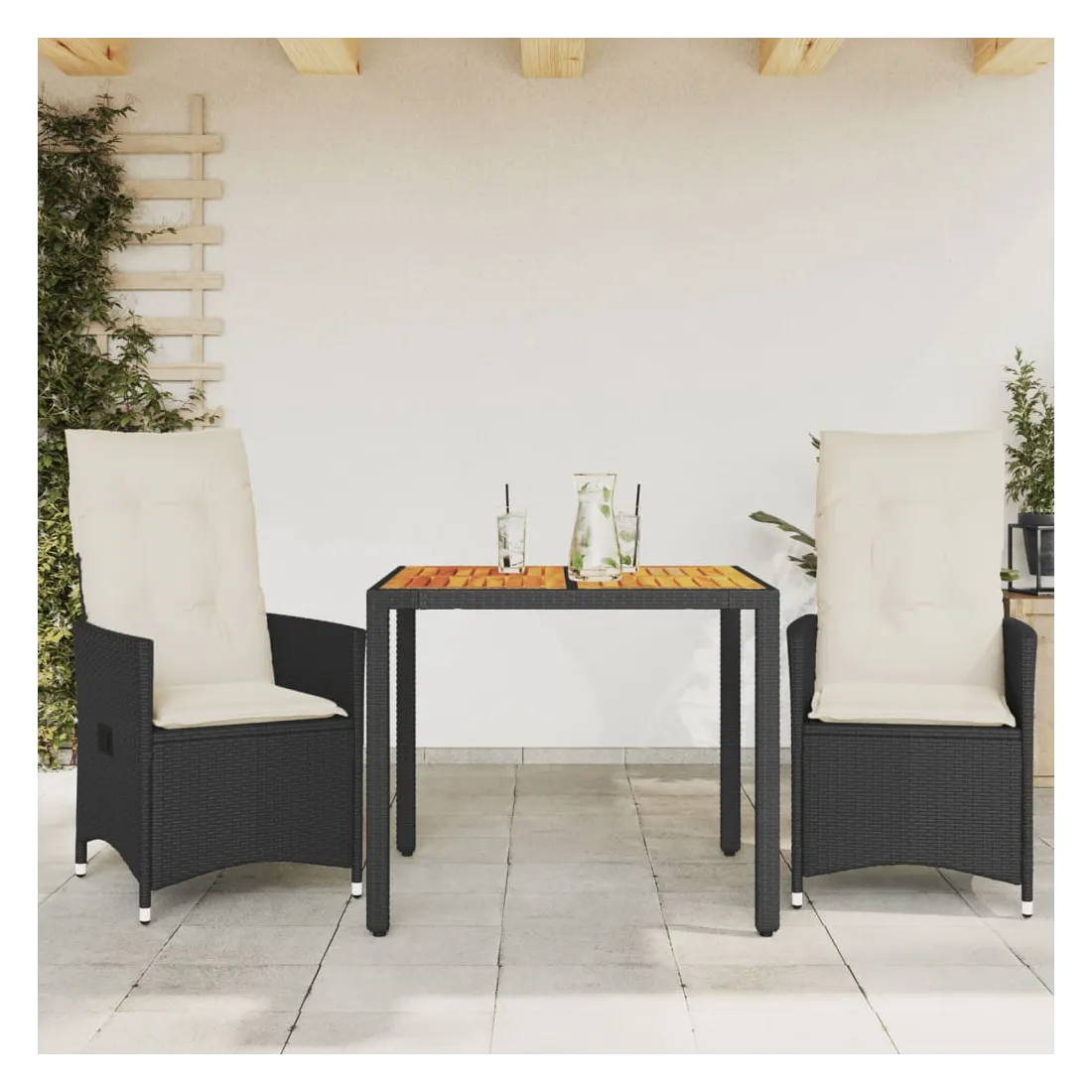 Savourez un café ou discutez avec votre famille et vos amis dans le jardin, l'arrière-cour ou sur le balcon avec cet ensemble de bistro confortable ! Matériau durable : la résine tressée, également connue sous le nom de poly rotin, est un matériau synthétique solide et nécessitant peu d'entretien qui ressemble au rotin naturel. Il est léger, facile à nettoyer et couramment utilisé pour les meubles d'extérieur en raison de sa durabilité et de ses propriétés de résistance aux intempéries.Dossier réglable : ce siège de jardin est doté d'une poignée. Vous pouvez régler le dossier dans n'importe quelle position en tirant sur la poignée et le remettre rapidement dans sa position initiale.Dessus stable et facile à nettoyer : cette table de jardin a un dessus en bois d'acacia robuste, durable et facile à nettoyer avec un chiffon humide.Expérience d'assise confortable : cet ensemble de meubles d'extérieur, doté de coussins épais, offre une expérience d'assise confortable.Housse amovible et lavable : ces coussins de siège sont dotés de housses amovibles pour un lavage et un entretien faciles. Bon à savoir :Pour que vos meubles d'extérieur restent beaux, nous vous recommandons de les protéger avec une housse imperméable.