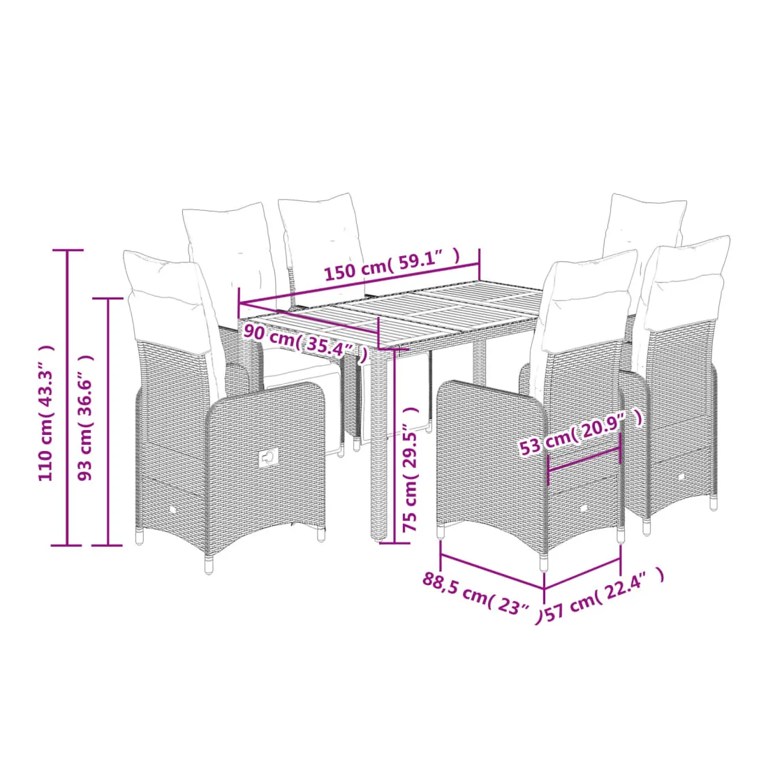 - 6 x coussin de siège avec housse amovible et lavable