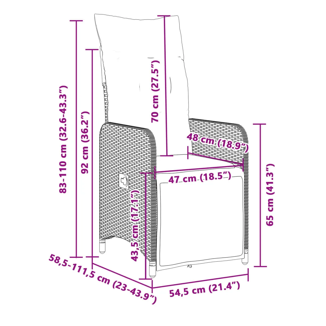 - Dimensions de l'assise : 54,5 x 58,5 x 92 cm (l x P x H)