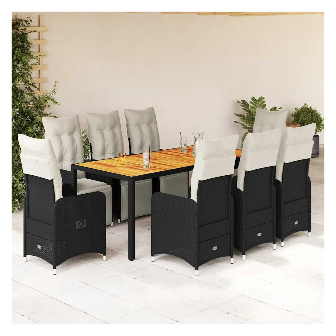 Savourez un café ou discutez avec votre famille et vos amis dans le jardin, l'arrière-cour ou sur le balcon avec cet ensemble de bistro confortable ! Matériau durable : la résine tressée, également connue sous le nom de poly rotin, est un matériau synthétique solide et nécessitant peu d'entretien qui ressemble au rotin naturel. Elle est légère, facile à nettoyer et couramment utilisée pour les meubles d'extérieur en raison de sa durabilité et de ses propriétés de résistance aux intempéries.Dossier et repose-pied réglables : ce siège de jardin est doté d'une poignée. Vous pouvez régler le dossier et le repose-pied dans n'importe quelle position en tirant sur la poignée, et le remettre rapidement dans sa position initiale.Expérience d'assise confortable : ce mobilier d'extérieur, doté de coussins épais, offre une expérience d'assise confortable.Housse amovible et lavable : ces coussins de siège sont dotés de housses amovibles pour un lavage et un entretien faciles. Les coussins de dossier ont un rabat à l'arrière pour une fixation facile aux dossiers.Dessus stable et facile à nettoyer : cette table de jardin a un dessus en bois d'acacia robuste, durable et facile à nettoyer avec un chiffon humide. Bon à savoir :Pour que vos meubles d'extérieur restent beaux, nous vous recommandons de les protéger avec une housse imperméable.