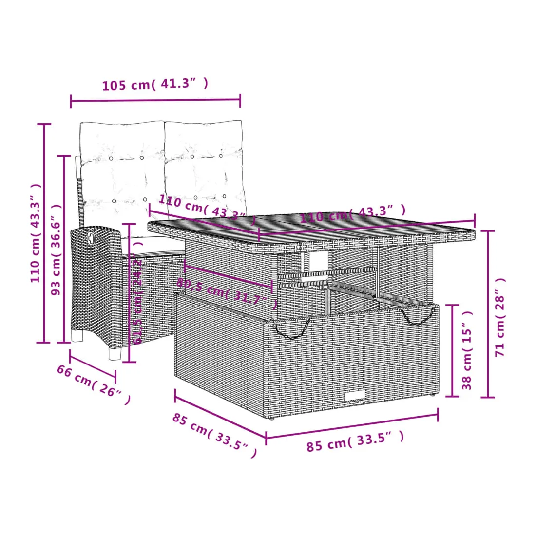 - Dimensions de la table : 110 x 110 x 40/71 cm (L x l x H)