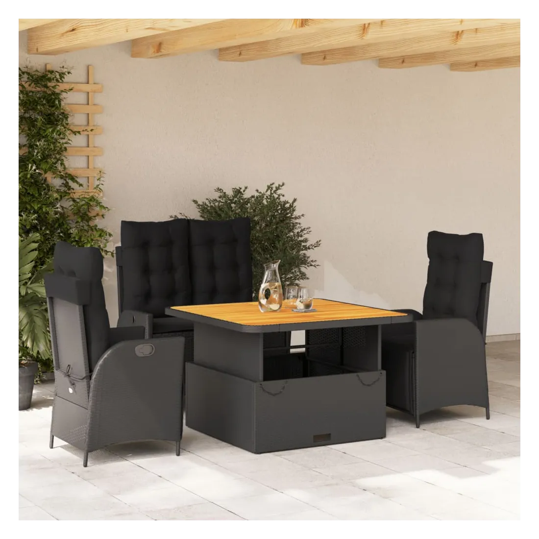 Cet ensemble de salle à manger de jardin est un excellent choix pour les repas en plein air ou simplement pour se détendre dans le jardin, la cour arrière ou sur la terrasse. Matériau durable : le rotin PE, également connu sous le nom de polyrotin, est un matériau synthétique solide et facile d'entretien qui ressemble au rotin naturel. Il est léger, facile à nettoyer et couramment utilisé pour les meubles d'extérieur en raison de sa durabilité et de ses propriétés de résistance aux intempéries. Dossier réglable : ce siège de jardin est équipé d'une poignée. Vous pouvez régler le dossier dans n'importe quelle position en tirant sur la poignée, puis le remettre rapidement dans sa position d'origine. Plateau réglable : le plateau peut être relevé pour rehausser la table, ce qui transforme la table d'extérieur en table basse ou en table à manger. Elle est parfaite pour recevoir des invités ou prendre des repas à l'extérieur. Housse amovible et lavable : ces coussins d'assise sont dotés de housses amovibles pour faciliter le lavage et l'entretien. Les coussins de dossier sont munis d'un rabat à l'arrière pour faciliter leur fixation aux dossiers. Assise confortable : Ce mobilier d'extérieur, doté de coussins épais et rembourrés, offre une assise confortable. Bon à savoir :Pour que votre mobilier d'extérieur reste beau, nous vous recommandons de le protéger avec une housse imperméable.