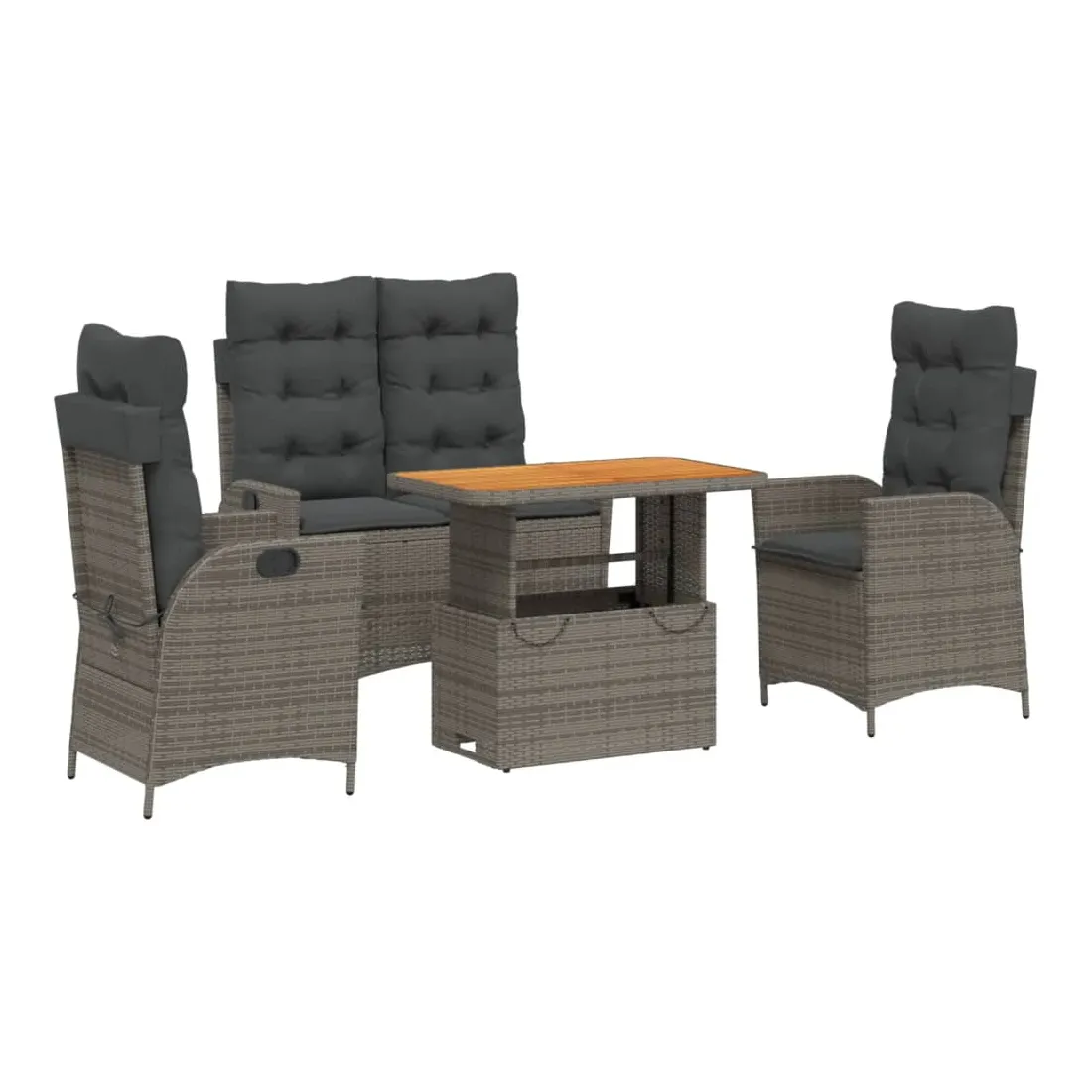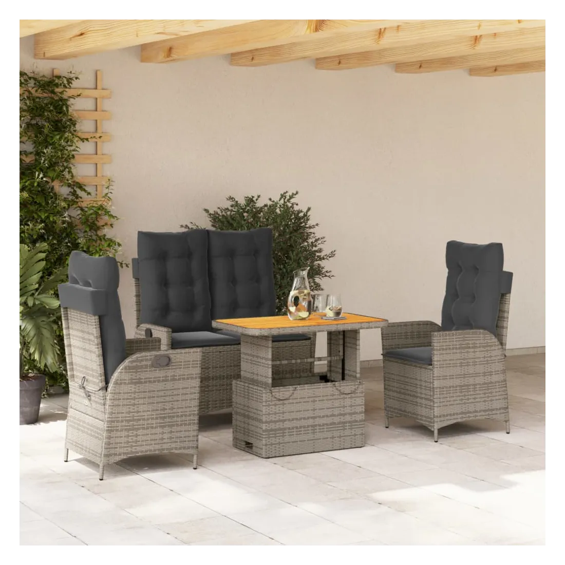Cet ensemble de salle à manger de jardin est un excellent choix pour les repas en plein air ou pour vous détendre dans le jardin, dans l'arrière-cour ou sur la terrasse. Matériau durable : la résine tressée, également connue sous le nom de poly rotin, est un matériau synthétique solide et nécessitant peu d'entretien qui ressemble au rotin naturel. Il est léger, facile à nettoyer et couramment utilisé pour les meubles d'extérieur en raison de sa durabilité et de ses propriétés de résistance aux intempéries.Dossier réglable : ce siège de jardin est doté d'une poignée. Vous pouvez régler le dossier dans n'importe quelle position en tirant sur la poignée et le remettre rapidement dans sa position initiale.Dessus de table réglable : le dessus de table peut être soulevé pour rendre la table plus haute, ce qui transforme la table d'extérieur d'une table basse à une table de salle à manger. Elle est parfaite pour recevoir des invités ou prendre des repas à l'extérieur.Housse amovible et lavable : ces coussins de siège sont dotés de housses amovibles pour un lavage et un entretien faciles. Les coussins de dossier ont un rabat à l'arrière pour une fixation facile aux dossiers.Expérience d'assise confortable : ce mobilier d'extérieur, doté de coussins épais, offre une expérience d'assise confortable. Bon à savoir :Pour que vos meubles d'extérieur restent beaux, nous vous recommandons de les protéger avec une housse imperméable.