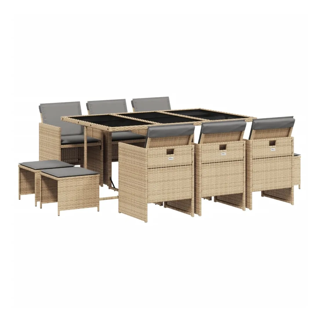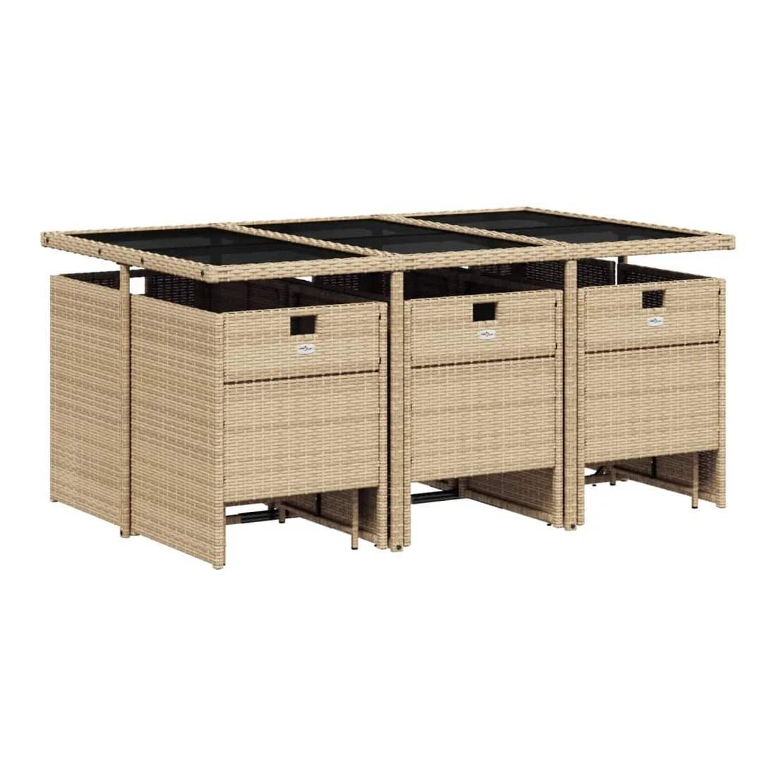 Cet ensemble de salle à manger de jardin est un excellent choix pour les repas en plein air ou pour vous détendre dans le jardin, dans l'arrière-cour ou sur la terrasse. Matériau durable : la résine tressée, également connue sous le nom de poly rotin, est un matériau synthétique solide et nécessitant peu d'entretien qui ressemble au rotin naturel. Il est léger, facile à nettoyer et couramment utilisé pour les meubles d'extérieur en raison de sa durabilité et de ses propriétés de résistance aux intempéries.Rangement compact : ces chaises sont dotées d'un dossier rabattable, ce qui permet de les ranger facilement sous la table. Une fois pliées, elles se rangent parfaitement sous la table, formant un cube peu encombrant. De plus, les tabourets peuvent également être rangés sous les chaises, maximisant encore davantage l'efficacité de l'espace. Expérience d'assise confortable : ce mobilier d'extérieur, doté de coussins épais, offre une expérience d'assise confortable.Housse amovible et lavable : ces coussins de siège sont dotés de housses amovibles pour un lavage et un entretien faciles.Dessus en verre : le dessus de la table d'extérieur est fabriqué en verre trempé solide et durable, ce qui le rend facile à nettoyer avec un chiffon humide et ajoute une touche d'élégance à votre espace extérieur. Bon à savoir : Pour que vos meubles d'extérieur restent beaux, nous vous recommandons de les protéger avec une housse imperméable.