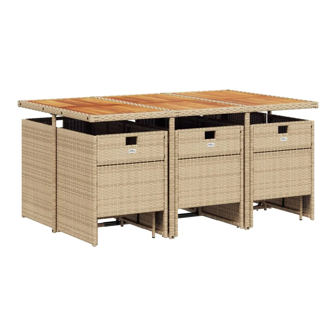vidaXLCet ensemble de salle à manger de jardin est un excellent choix pour les repas en plein air ou pour vous détendre dans le jardin, dans l'arrière-cour ou sur la terrasse. Matériau durable : la résine tressée, également connue sous le nom de poly rotin, est un matériau synthétique solide et nécessitant peu d'entretien qui ressemble au rotin naturel. Il est léger, facile à nettoyer et couramment utilisé pour les meubles d'extérieur en raison de sa durabilité et de ses propriétés de résistance aux intempéries.Rangement compact : ces chaises sont dotées d'un dossier rabattable, ce qui permet de les ranger facilement sous la table. Une fois pliées, elles se rangent parfaitement sous la table, formant un cube peu encombrant. De plus, les tabourets peuvent également être rangés sous les chaises, maximisant encore davantage l'efficacité de l'espace. Expérience d'assise confortable : ce mobilier d'extérieur, doté de coussins épais, offre une expérience d'assise confortable.Housse amovible et lavable : ces coussins de siège sont dotés de housses amovibles pour un lavage et un entretien faciles.Dessus stable et facile à nettoyer : cette table de jardin a un dessus en bois d'acacia robuste, durable et facile à nettoyer avec un chiffon humide. Bon à savoir : Pour que vos meubles d'extérieur restent beaux, nous vous recommandons de les protéger avec une housse imperméable.