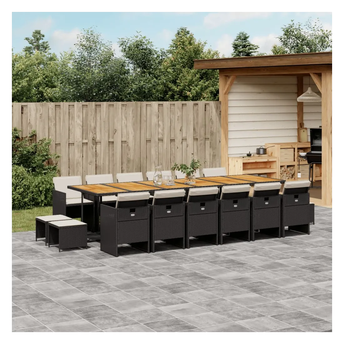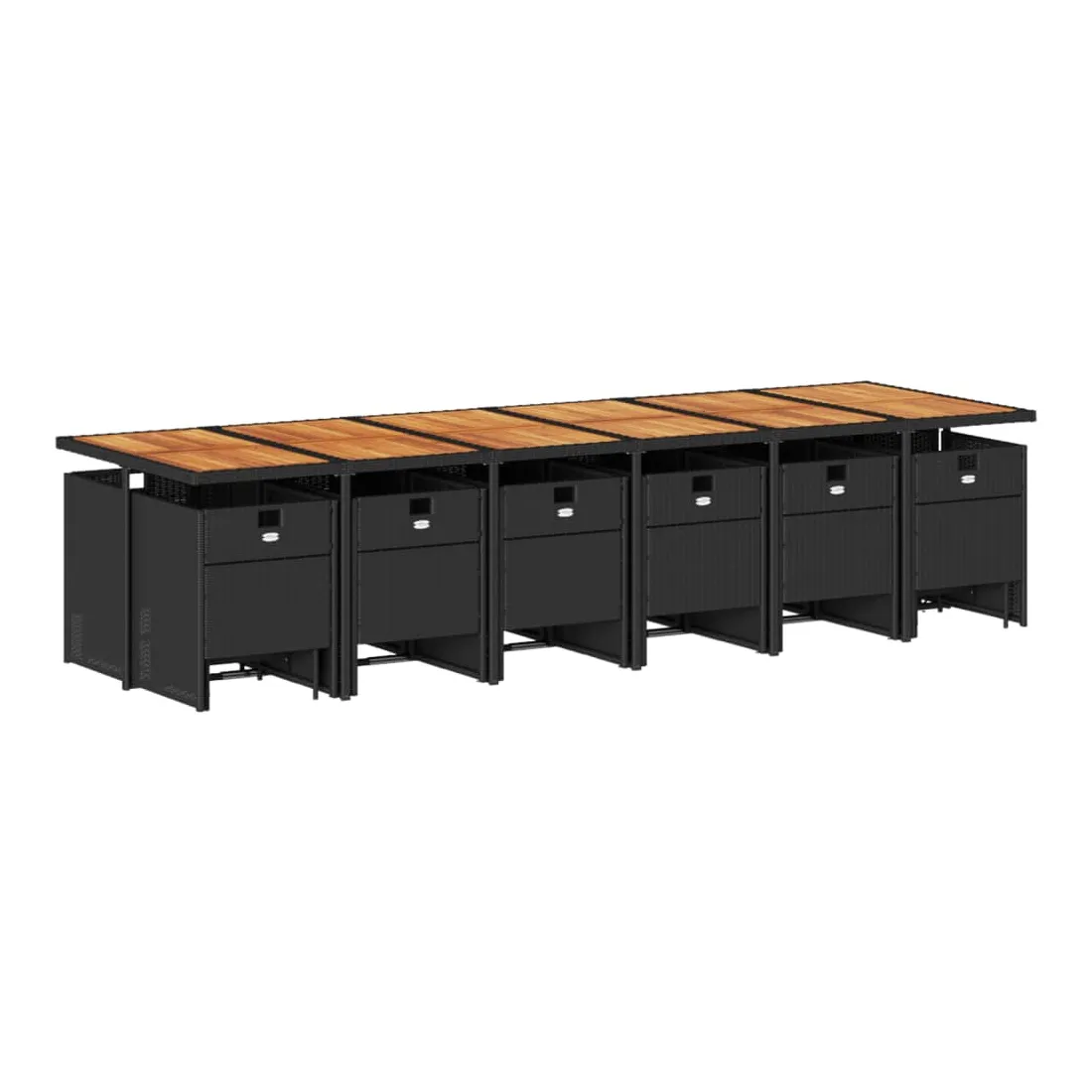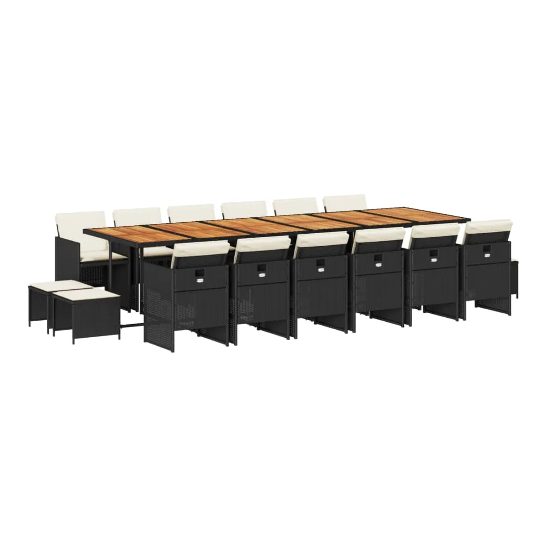 vidaXLCet ensemble de salle à manger de jardin est un excellent choix pour les repas en plein air ou pour vous détendre dans le jardin, dans l'arrière-cour ou sur la terrasse. Matériau durable : la résine tressée, également connue sous le nom de poly rotin, est un matériau synthétique solide et nécessitant peu d'entretien qui ressemble au rotin naturel. Il est léger, facile à nettoyer et couramment utilisé pour les meubles d'extérieur en raison de sa durabilité et de ses propriétés de résistance aux intempéries.Rangement compact : ces chaises sont dotées d'un dossier rabattable, ce qui permet de les ranger facilement sous la table. Une fois pliées, elles se rangent parfaitement sous la table, formant un cube peu encombrant. De plus, les tabourets peuvent également être rangés sous les chaises, maximisant encore davantage l'efficacité de l'espace. Expérience d'assise confortable : ce mobilier d'extérieur, doté de coussins épais, offre une expérience d'assise confortable.Housse amovible et lavable : ces coussins de siège sont dotés de housses amovibles pour un lavage et un entretien faciles.Dessus stable et facile à nettoyer : cette table de jardin a un dessus en bois d'acacia robuste, durable et facile à nettoyer avec un chiffon humide. Bon à savoir : Pour que vos meubles d'extérieur restent beaux, nous vous recommandons de les protéger avec une housse imperméable.