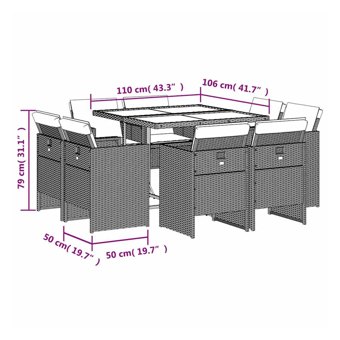 Cet ensemble de salle à manger de jardin est un excellent choix pour les repas en plein air ou pour vous détendre dans le jardin, dans l'arrière-cour ou sur la terrasse. Matériau durable : la résine tressée, également connue sous le nom de poly rotin, est un matériau synthétique solide et nécessitant peu d'entretien qui ressemble au rotin naturel. Il est léger, facile à nettoyer et couramment utilisé pour les meubles d'extérieur en raison de sa durabilité et de ses propriétés de résistance aux intempéries.Rangement compact : ces chaises sont dotées d'un dossier rabattable, ce qui permet de les ranger facilement sous la table. Une fois pliées, elles se rangent parfaitement sous la table, formant un cube peu encombrant. Expérience d'assise confortable : ce mobilier d'extérieur, doté de coussins épais, offre une expérience d'assise confortable.Housse amovible et lavable : ces coussins de siège sont dotés de housses amovibles pour un lavage et un entretien faciles.Dessus en verre : le dessus de la table d'extérieur est fabriqué en verre trempé solide et durable, ce qui le rend facile à nettoyer avec un chiffon humide et ajoute une touche d'élégance à votre espace extérieur. Bon à savoir : Pour que vos meubles d'extérieur restent beaux, nous vous recommandons de les protéger avec une housse imperméable.