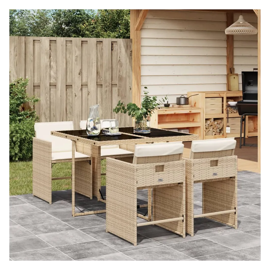 Cet ensemble de salle à manger de jardin est un excellent choix pour les repas en plein air ou pour vous détendre dans le jardin, dans l'arrière-cour ou sur la terrasse. Matériau durable : la résine tressée, également connue sous le nom de poly rotin, est un matériau synthétique solide et nécessitant peu d'entretien qui ressemble au rotin naturel. Il est léger, facile à nettoyer et couramment utilisé pour les meubles d'extérieur en raison de sa durabilité et de ses propriétés de résistance aux intempéries.Rangement compact : ces chaises sont dotées d'un dossier rabattable, ce qui permet de les ranger facilement sous la table. Une fois pliées, elles se rangent parfaitement sous la table, formant un cube peu encombrant.Expérience d'assise confortable : ce mobilier d'extérieur, doté de coussins épais, offre une expérience d'assise confortable.Housse amovible et lavable : ces coussins de siège sont dotés de housses amovibles pour un lavage et un entretien faciles. Les housses de coussin de chaise ont un rabat à l'arrière pour une fixation facile aux chaises.Dessus stable et facile à nettoyer : cette table de jardin est dotée d'un dessus en verre trempé robuste, durable et facile à nettoyer à l'aide d'un chiffon humide. Bon à savoir : Pour que vos meubles d'extérieur restent beaux, nous vous recommandons de les protéger avec une housse imperméable.