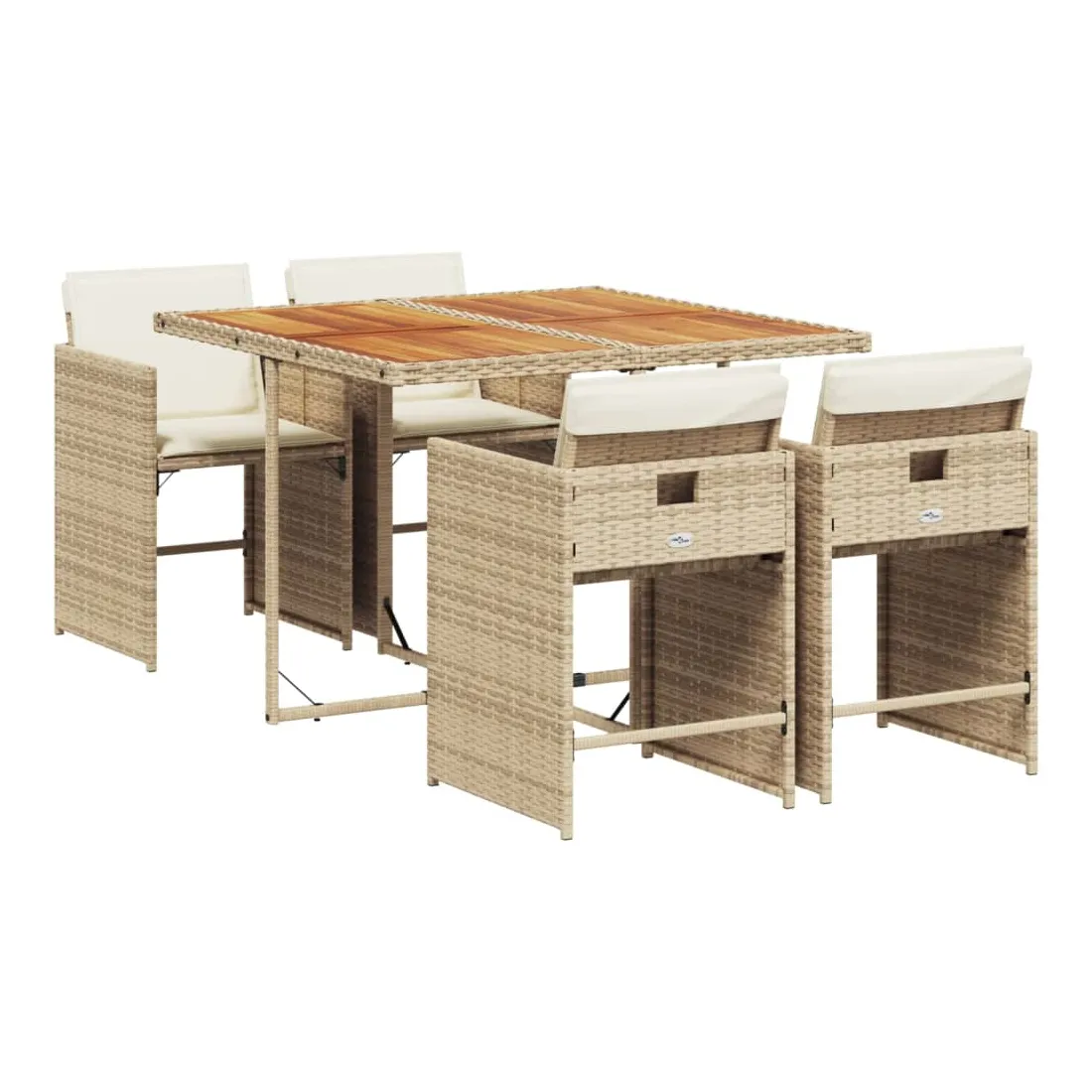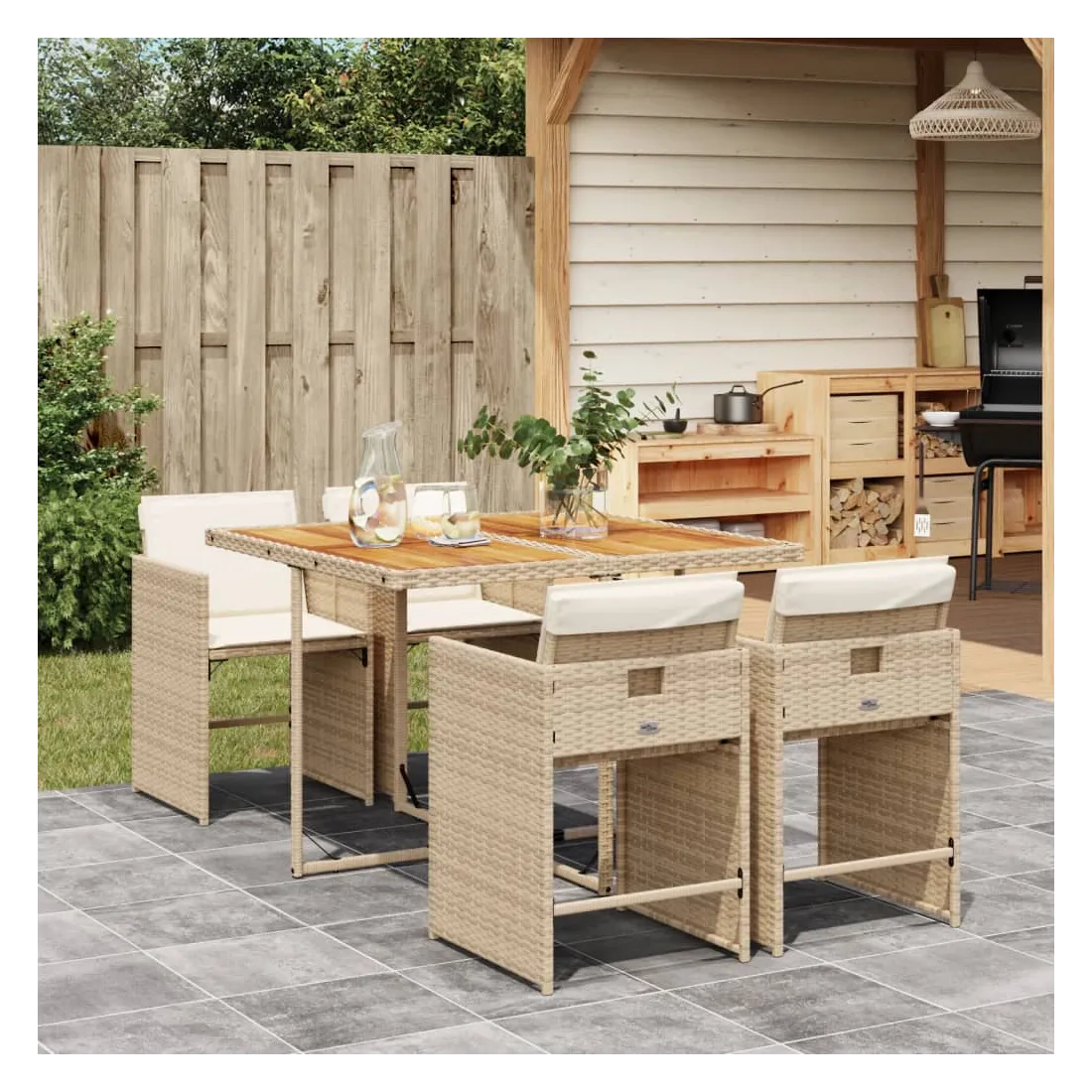Cet ensemble de salle à manger de jardin est un excellent choix pour les repas en plein air ou pour vous détendre dans le jardin, dans l'arrière-cour ou sur la terrasse. Matériau durable : la résine tressée, également connue sous le nom de poly rotin, est un matériau synthétique solide et nécessitant peu d'entretien qui ressemble au rotin naturel. Il est léger, facile à nettoyer et couramment utilisé pour les meubles d'extérieur en raison de sa durabilité et de ses propriétés de résistance aux intempéries.Rangement compact : ces chaises sont dotées d'un dossier rabattable, ce qui permet de les ranger facilement sous la table. Une fois pliées, elles se rangent parfaitement sous la table, formant un cube peu encombrant.Expérience d'assise confortable : ce mobilier d'extérieur, doté de coussins épais, offre une expérience d'assise confortable.Housse amovible et lavable : ces coussins de siège sont dotés de housses amovibles pour un lavage et un entretien faciles. Les housses de coussin de chaise ont un rabat à l'arrière pour une fixation facile aux chaises.Dessus stable et facile à nettoyer : cette table de jardin a un dessus en bois d'acacia robuste, durable et facile à nettoyer avec un chiffon humide. Bon à savoir : Pour que vos meubles d'extérieur restent beaux, nous vous recommandons de les protéger avec une housse imperméable.