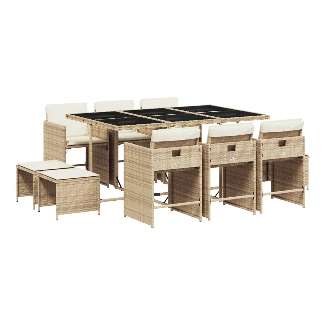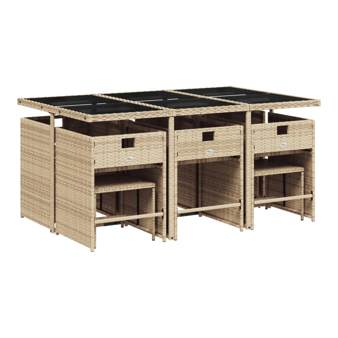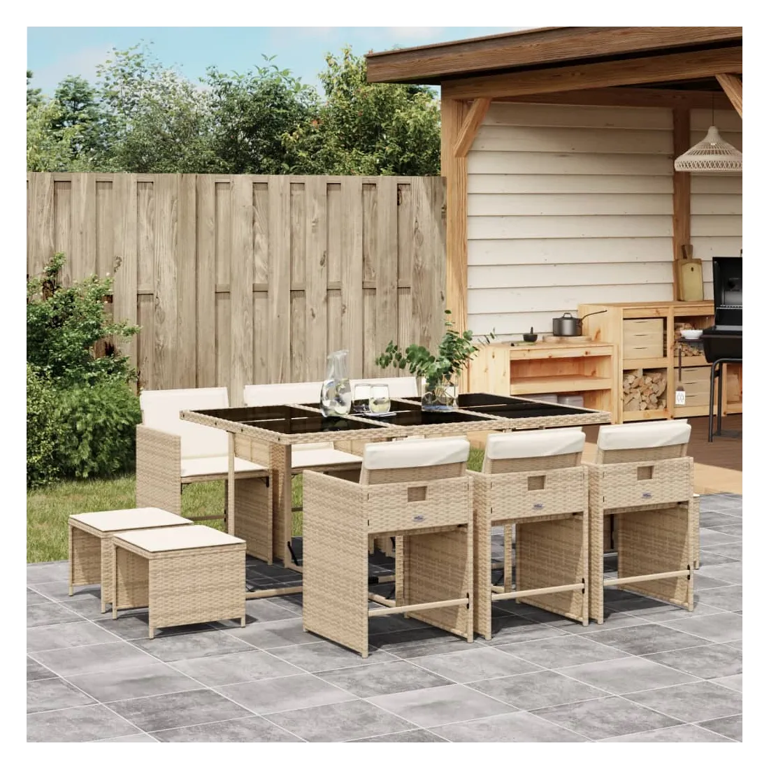 Cet ensemble de salle à manger de jardin est un excellent choix pour les repas en plein air ou pour vous détendre dans le jardin, dans l'arrière-cour ou sur la terrasse. Matériau durable : la résine tressée, également connue sous le nom de poly rotin, est un matériau synthétique solide et nécessitant peu d'entretien qui ressemble au rotin naturel. Il est léger, facile à nettoyer et couramment utilisé pour les meubles d'extérieur en raison de sa durabilité et de ses propriétés de résistance aux intempéries.Rangement compact : ces chaises sont dotées d'un dossier rabattable, ce qui permet de les ranger facilement sous la table. Une fois pliées, elles se rangent parfaitement sous la table, formant un cube peu encombrant. De plus, les tabourets peuvent également être rangés sous les chaises, maximisant encore davantage l'efficacité de l'espace.Expérience d'assise confortable : ce mobilier d'extérieur, doté de coussins épais, offre une expérience d'assise confortable.Housse amovible et lavable : ces coussins de siège sont dotés de housses amovibles pour un lavage et un entretien faciles. Les housses de coussin de chaise ont un rabat à l'arrière pour une fixation facile aux chaises.Dessus stable et facile à nettoyer : cette table de jardin est dotée d'un dessus en verre trempé robuste, durable et facile à nettoyer à l'aide d'un chiffon humide. Bon à savoir : Pour que vos meubles d'extérieur restent beaux, nous vous recommandons de les protéger avec une housse imperméable.
