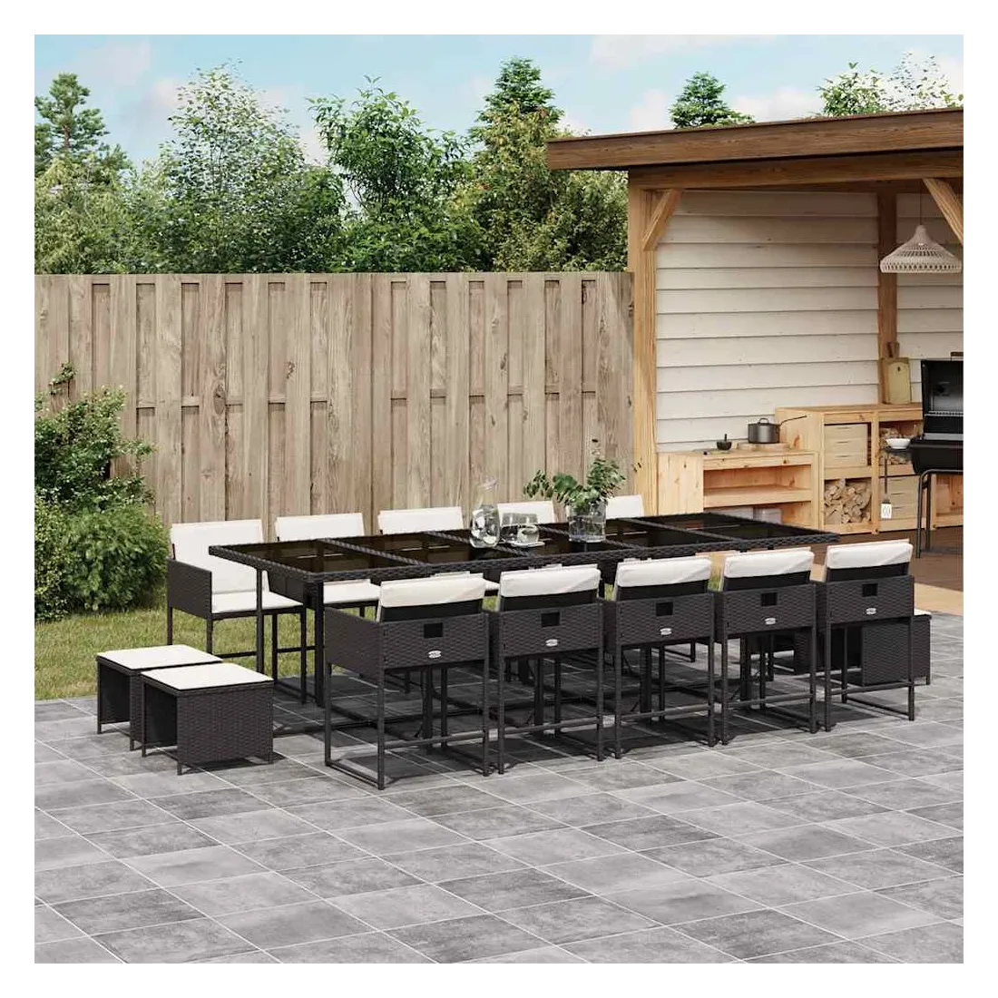 vidaXLCet ensemble de salle à manger de jardin est un excellent choix pour les repas en plein air ou pour vous détendre dans le jardin, dans l'arrière-cour ou sur la terrasse. Matériau durable : la résine tressée, également connue sous le nom de poly rotin, est un matériau synthétique solide et nécessitant peu d'entretien qui ressemble au rotin naturel. Il est léger, facile à nettoyer et couramment utilisé pour les meubles d'extérieur en raison de sa durabilité et de ses propriétés de résistance aux intempéries.Rangement compact : ces chaises sont dotées d'un dossier rabattable, ce qui permet de les ranger facilement sous la table. Une fois pliées, elles se rangent parfaitement sous la table, formant un cube peu encombrant. De plus, les tabourets peuvent également être rangés sous les chaises, maximisant encore davantage l'efficacité de l'espace.Expérience d'assise confortable : ce mobilier d'extérieur, doté de coussins épais, offre une expérience d'assise confortable.Housse amovible et lavable : ces coussins de siège sont dotés de housses amovibles pour un lavage et un entretien faciles. Les housses de coussin ont un rabat à l'arrière pour une fixation facile aux dossiers.Dessus en verre : le dessus de la table d'extérieur est fabriqué en verre trempé solide et durable, ce qui le rend facile à nettoyer avec un chiffon humide et ajoute une touche d'élégance à votre espace extérieur. Bon à savoir : Pour que vos meubles d'extérieur restent beaux, nous vous recommandons de les protéger avec une housse imperméable.