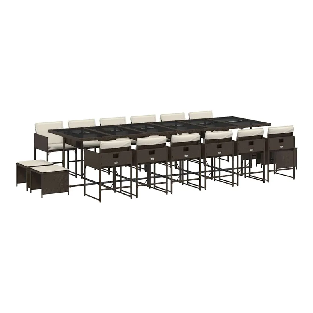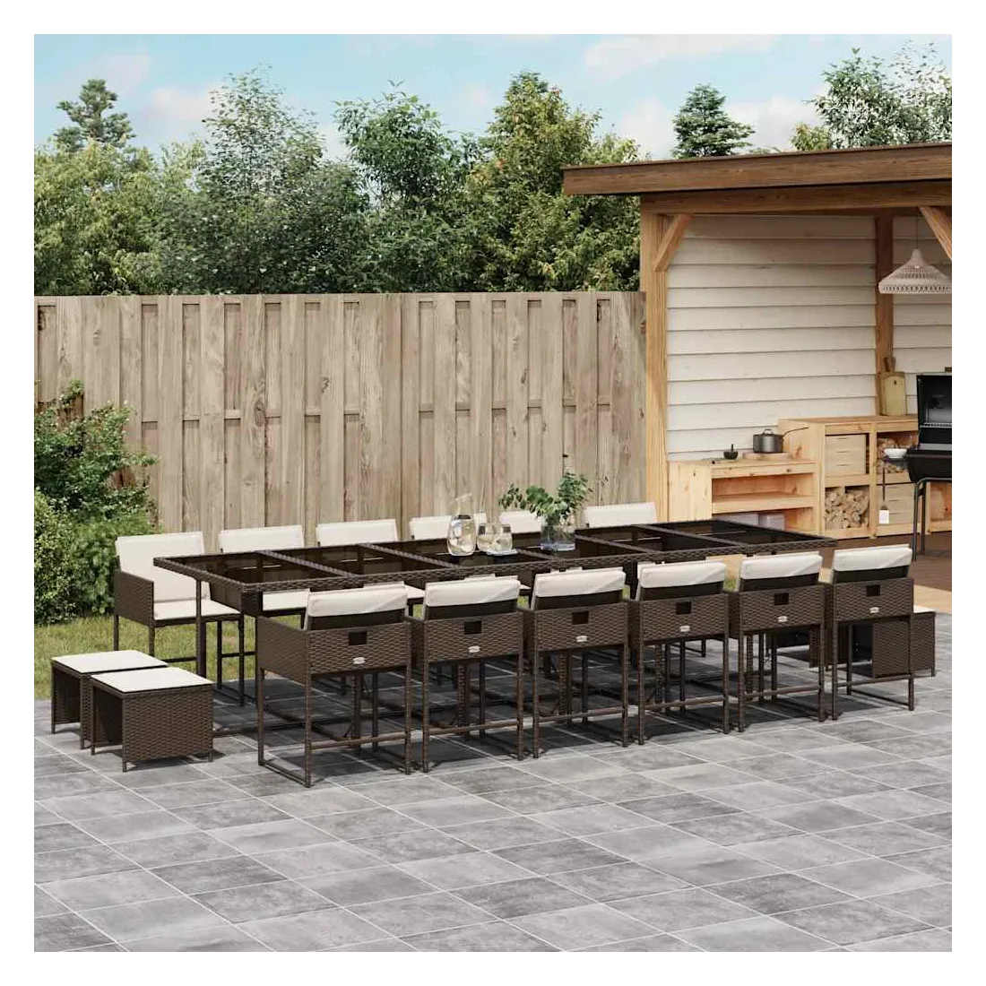 Cet ensemble de salle à manger de jardin est un excellent choix pour les repas en plein air ou pour vous détendre dans le jardin, dans l'arrière-cour ou sur la terrasse. Matériau durable : la résine tressée, également connue sous le nom de poly rotin, est un matériau synthétique solide et nécessitant peu d'entretien qui ressemble au rotin naturel. Il est léger, facile à nettoyer et couramment utilisé pour les meubles d'extérieur en raison de sa durabilité et de ses propriétés de résistance aux intempéries.Rangement compact : ces chaises sont dotées d'un dossier rabattable, ce qui permet de les ranger facilement sous la table. Une fois pliées, elles se rangent parfaitement sous la table, formant un cube peu encombrant. De plus, les tabourets peuvent également être rangés sous les chaises, maximisant encore davantage l'efficacité de l'espace.Expérience d'assise confortable : ce mobilier d'extérieur, doté de coussins épais, offre une expérience d'assise confortable.Housse amovible et lavable : ces coussins de siège sont dotés de housses amovibles pour un lavage et un entretien faciles. Les housses de coussin ont un rabat à l'arrière pour une fixation facile aux dossiers.Dessus en verre : le dessus de la table d'extérieur est fabriqué en verre trempé solide et durable, ce qui le rend facile à nettoyer avec un chiffon humide et ajoute une touche d'élégance à votre espace extérieur. Bon à savoir : Pour que vos meubles d'extérieur restent beaux, nous vous recommandons de les protéger avec une housse imperméable.
