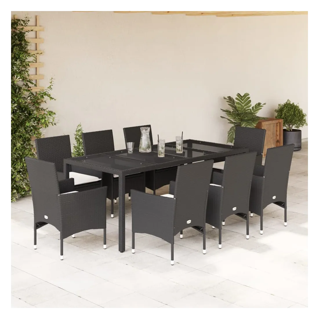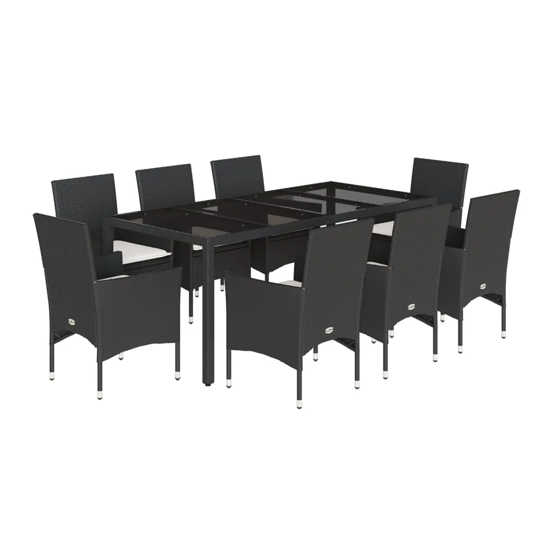 Ensemble à manger de jardin et coussins 9 pcs noir rotin verre