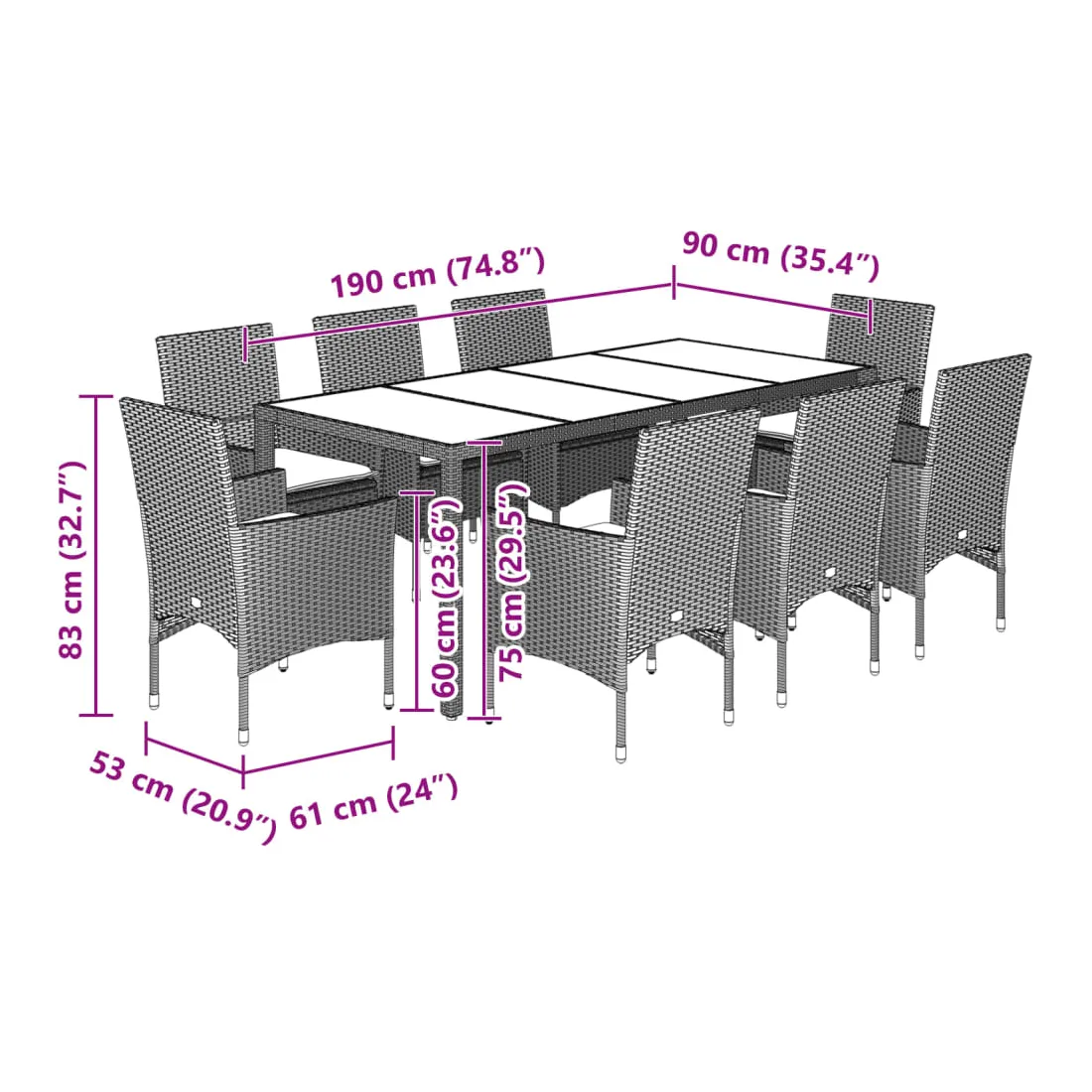 vidaXLCet ensemble de salle à manger de jardin est un excellent choix pour les repas en plein air ou pour vous détendre dans le jardin, dans l'arrière-cour ou sur la terrasse. Matériau durable : la résine tressée, également connue sous le nom de poly rotin, est un matériau synthétique solide et nécessitant peu d'entretien qui ressemble au rotin naturel. Il est léger, facile à nettoyer et couramment utilisé pour les meubles d'extérieur en raison de sa durabilité et de ses propriétés de résistance aux intempéries.Expérience d'assise confortable : cet ensemble de meubles d'extérieur, doté de coussins épais, offre une expérience d'assise confortable.Housse amovible et lavable : ces coussins de siège sont dotés de housses amovibles pour un lavage et un entretien faciles.Dessus en verre : le dessus de la table d'extérieur est fabriqué en verre trempé solide et durable, ce qui le rend facile à nettoyer avec un chiffon humide et ajoute une touche d'élégance à votre espace extérieur. Bon à savoir :Pour que vos meubles d'extérieur restent beaux, nous vous recommandons de les protéger avec une housse imperméable.