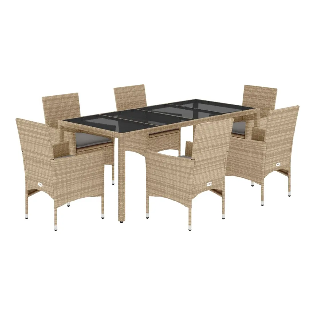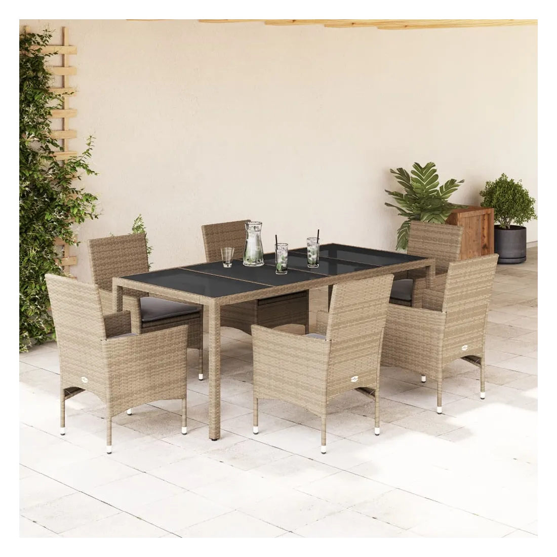 Cet ensemble de salle à manger de jardin est un excellent choix pour les repas en plein air ou pour vous détendre dans le jardin, dans l'arrière-cour ou sur la terrasse. Matériau durable : la résine tressée, également connue sous le nom de poly rotin, est un matériau synthétique solide et nécessitant peu d'entretien qui ressemble au rotin naturel. Il est léger, facile à nettoyer et couramment utilisé pour les meubles d'extérieur en raison de sa durabilité et de ses propriétés de résistance aux intempéries.Expérience d'assise confortable : cet ensemble de meubles d'extérieur, doté de coussins épais, offre une expérience d'assise confortable.Housse amovible et lavable : ces coussins de siège sont dotés de housses amovibles pour un lavage et un entretien faciles.Dessus en verre : le dessus de la table d'extérieur est fabriqué en verre trempé solide et durable, ce qui le rend facile à nettoyer avec un chiffon humide et ajoute une touche d'élégance à votre espace extérieur. Bon à savoir :Pour que vos meubles d'extérieur restent beaux, nous vous recommandons de les protéger avec une housse imperméable.