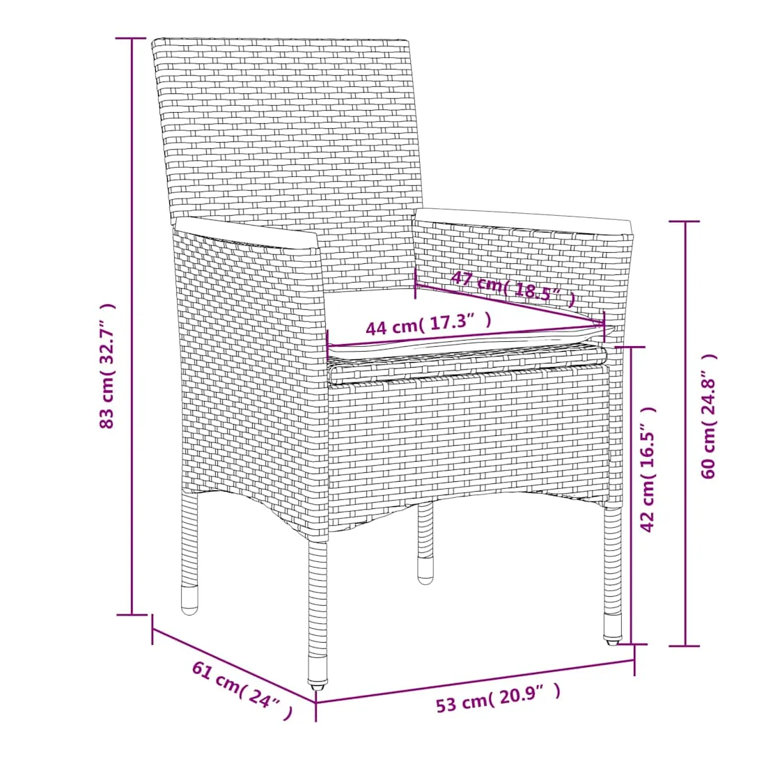 - Hauteur du siège à partir du sol (sans coussin) : 42 cm