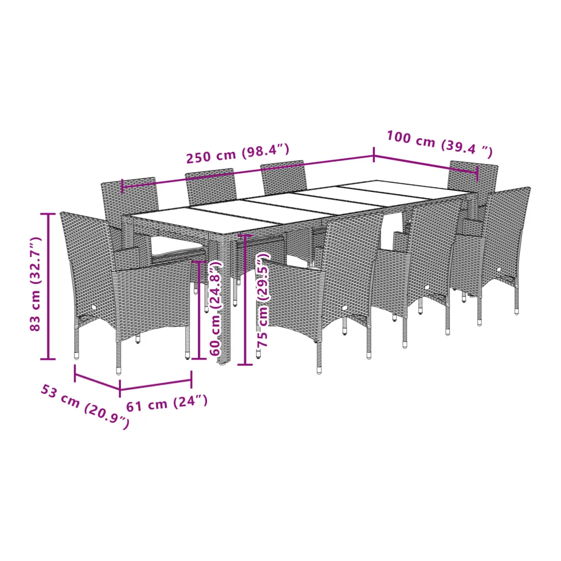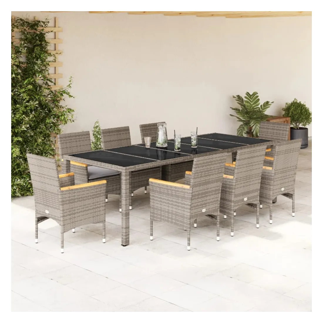 Ensemble à manger de jardin et coussins 9 pcs gris rotin verre